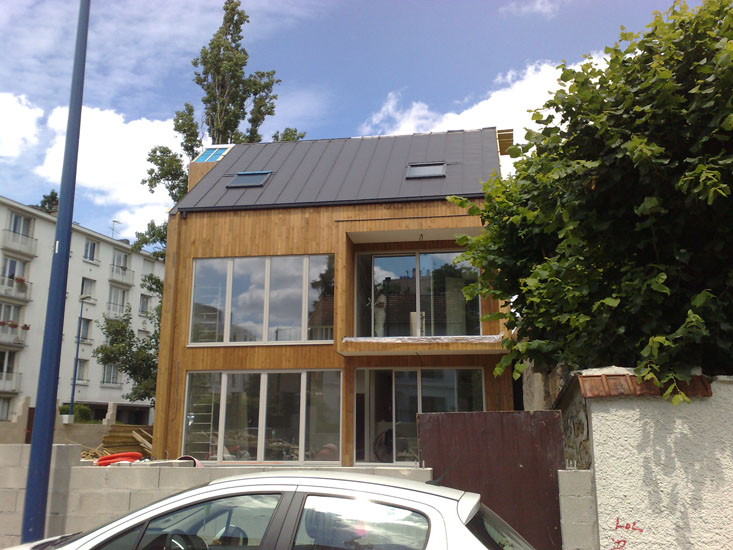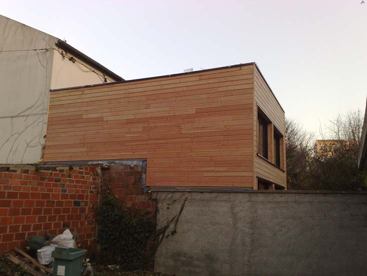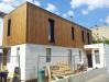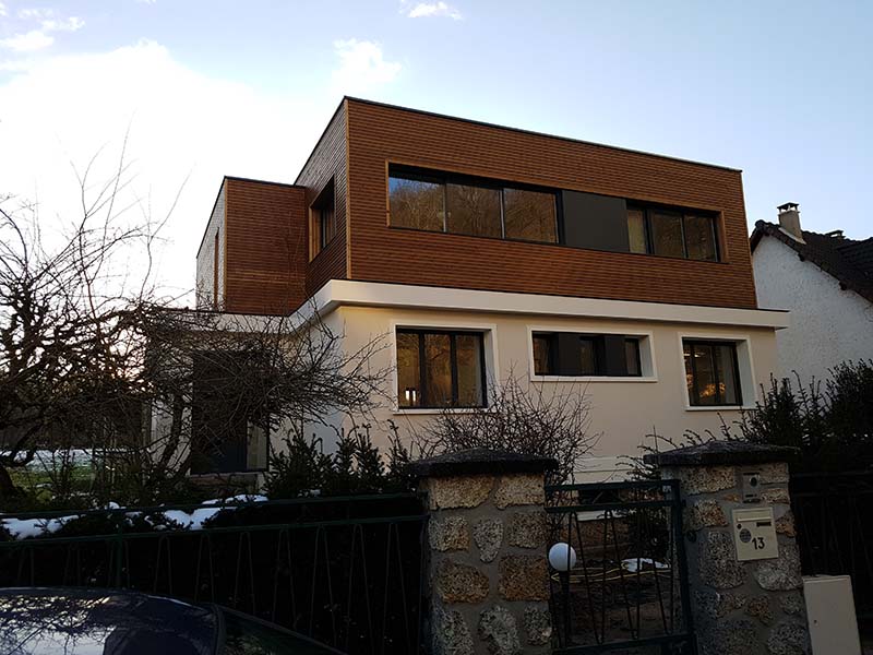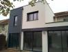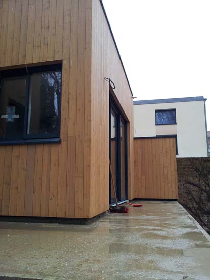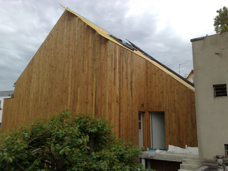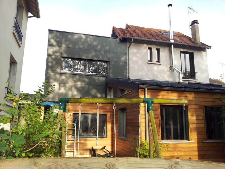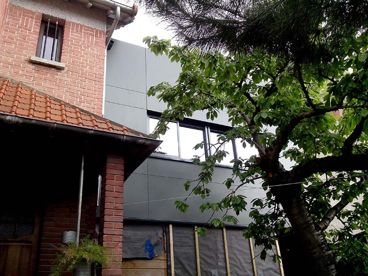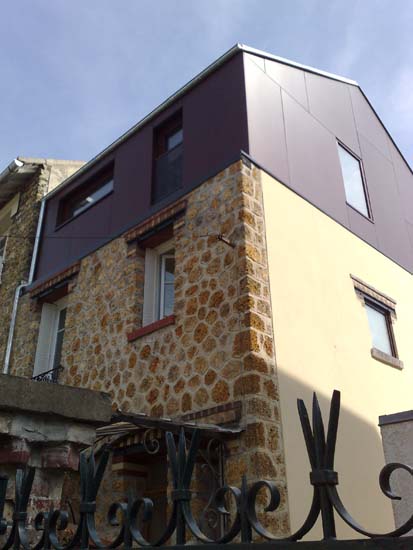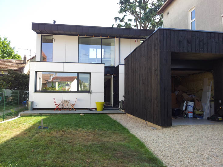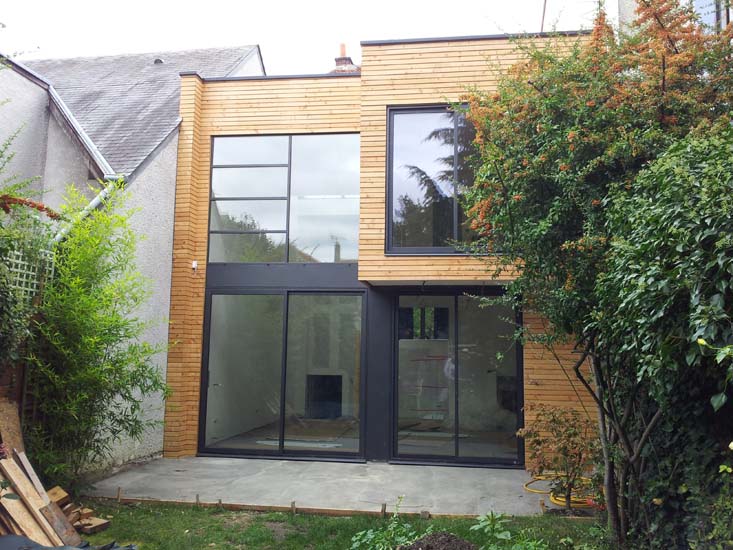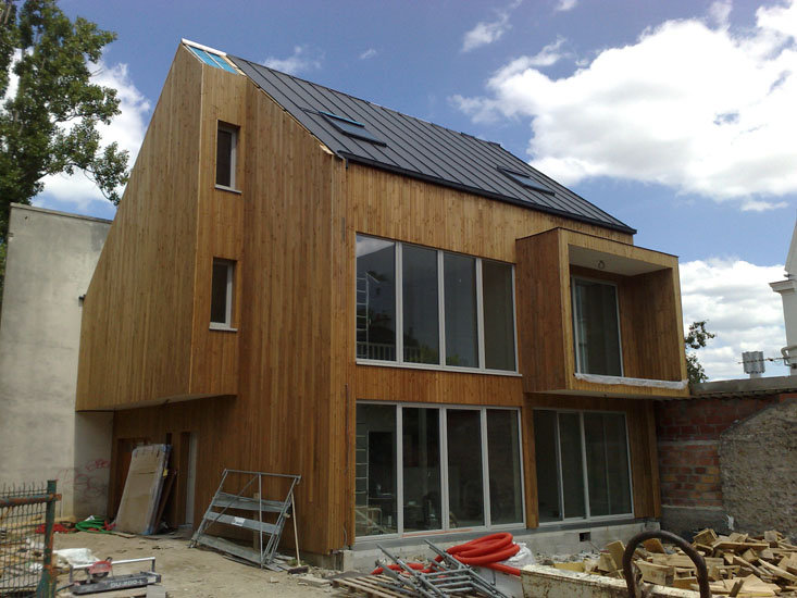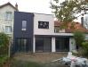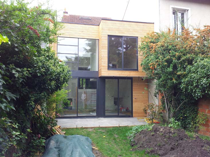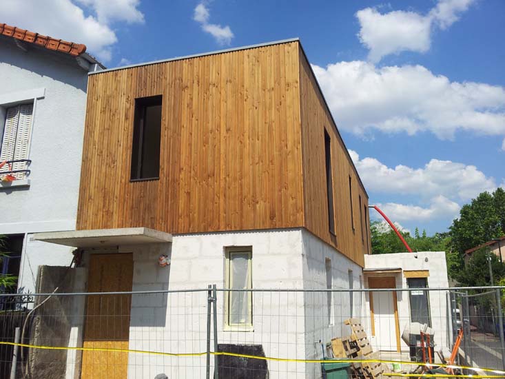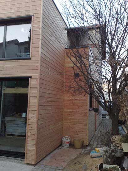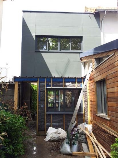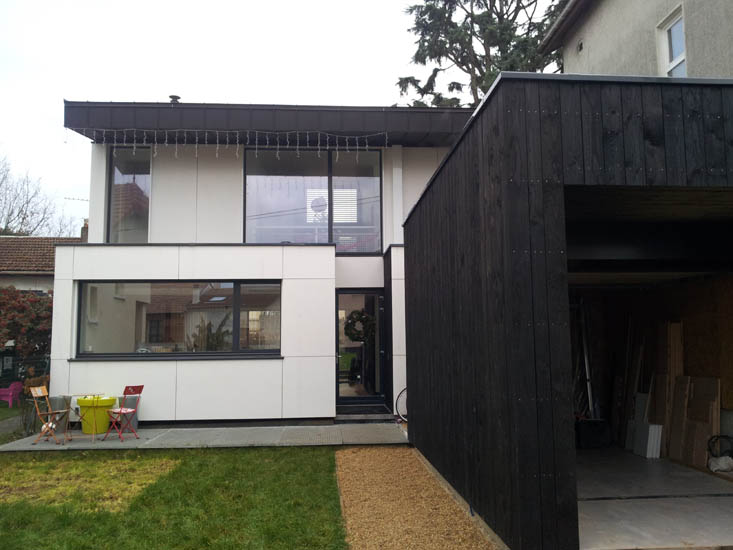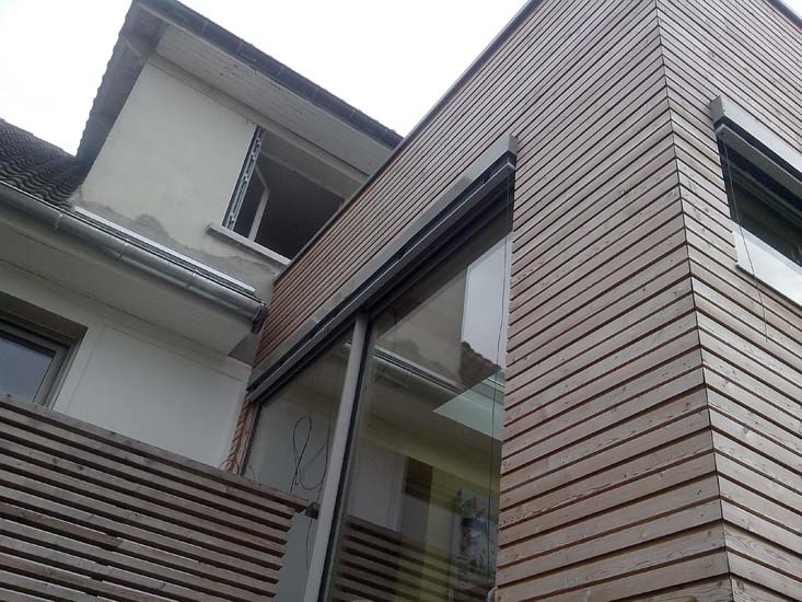 Extension sur deux étages. Toiture avec étanchéité EPDM, skydôme et végétalisation. Isolation extérieure de l'existant et bardage bois en mélèze de l'ensemble.