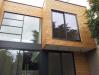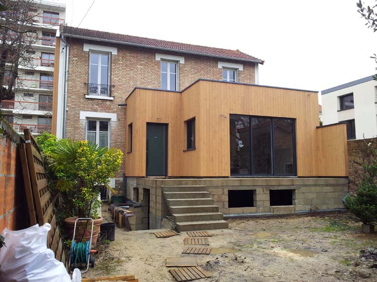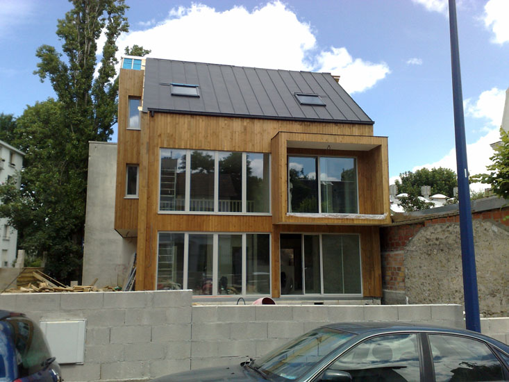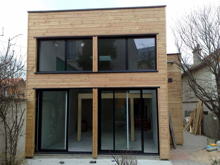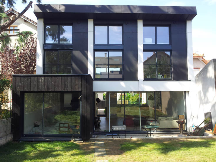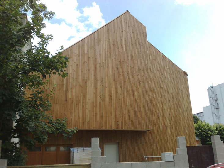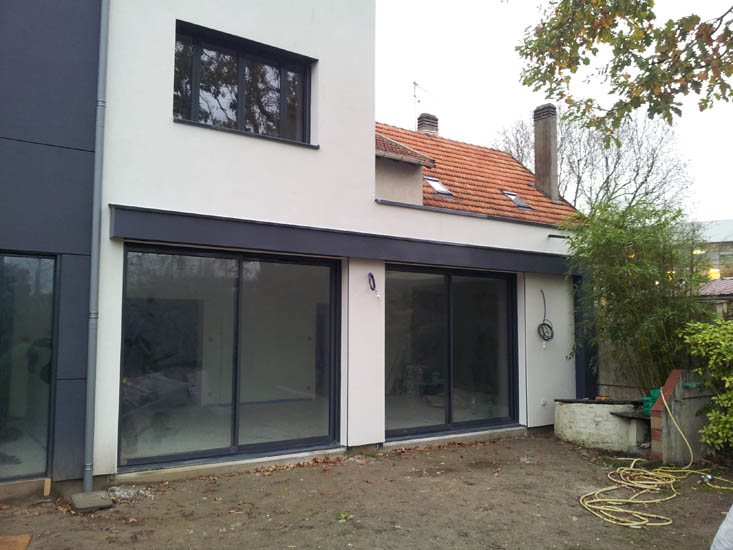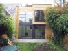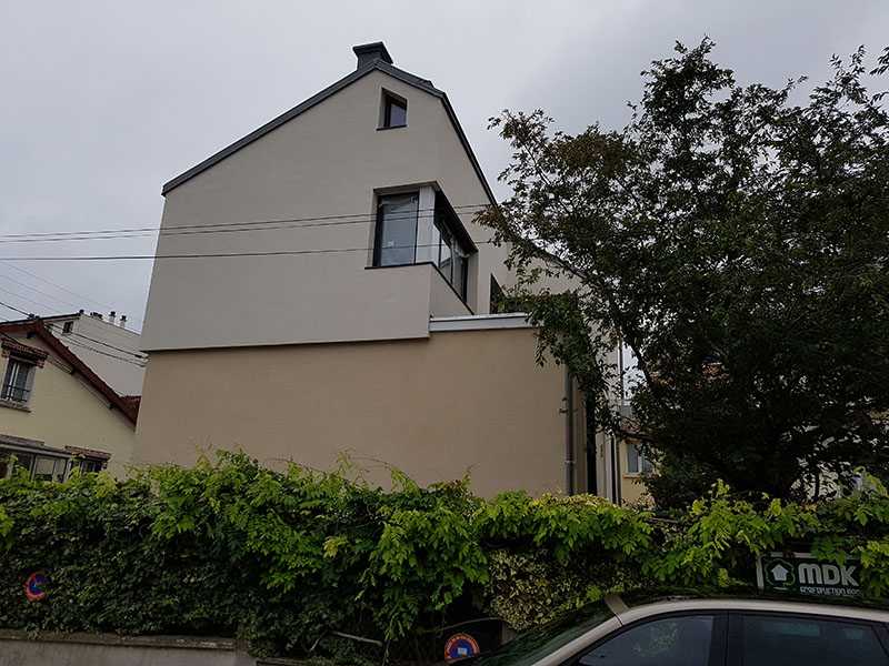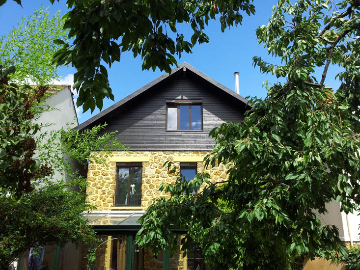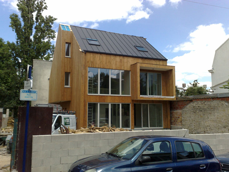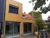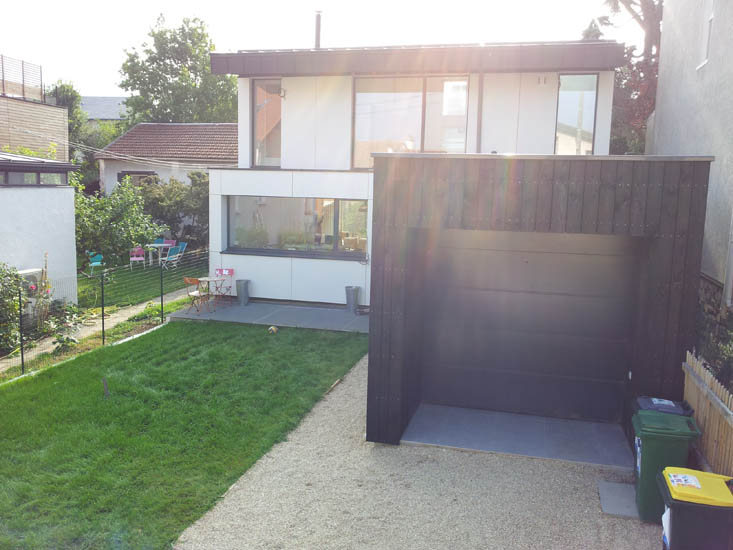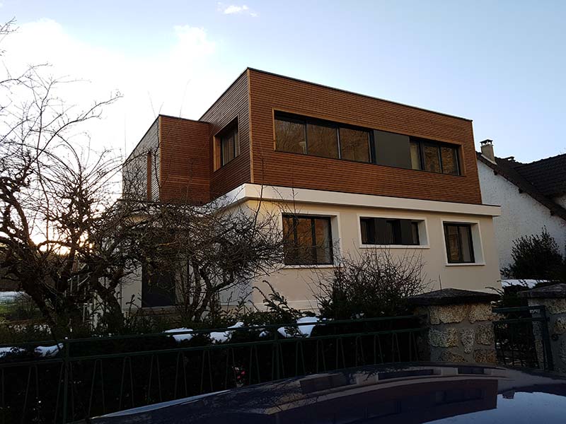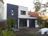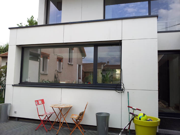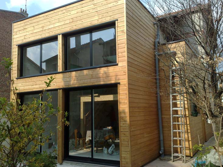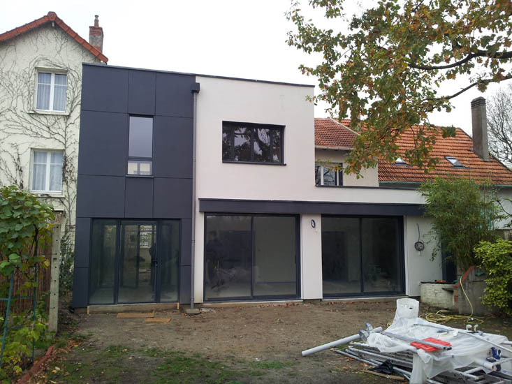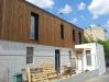 Extension sur deux étages. Toiture avec étanchéité EPDM, skydôme et végétalisation. Isolation extérieure de l'existant et bardage bois en mélèze de l'ensemble.