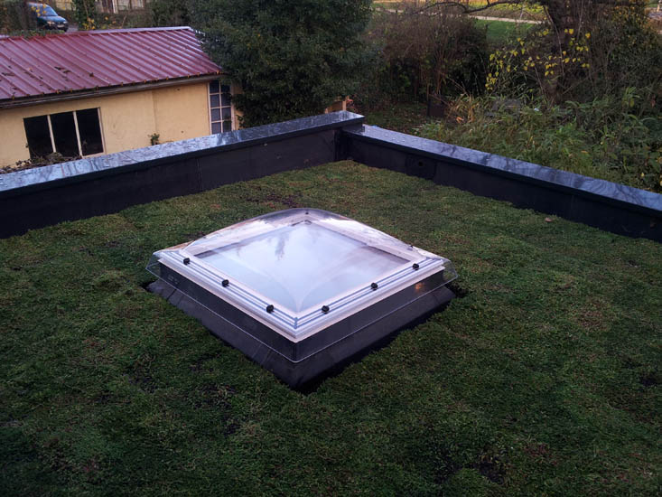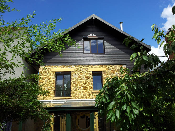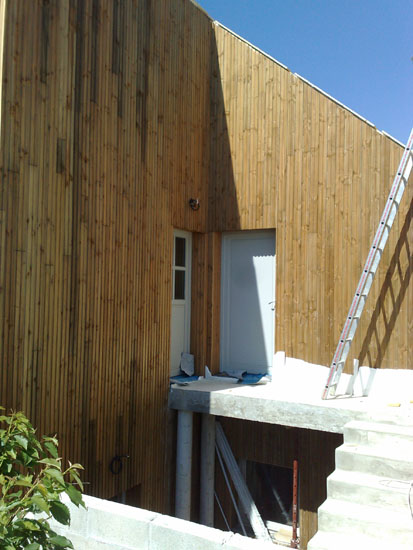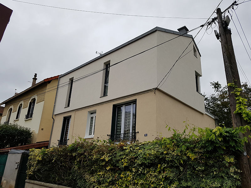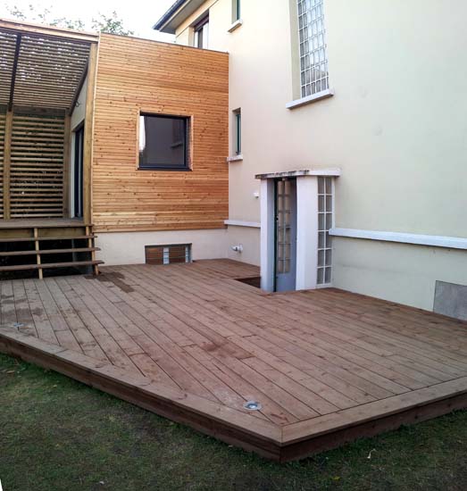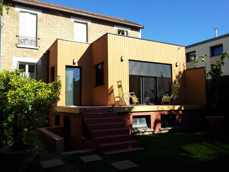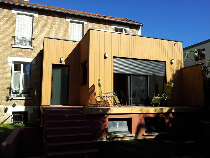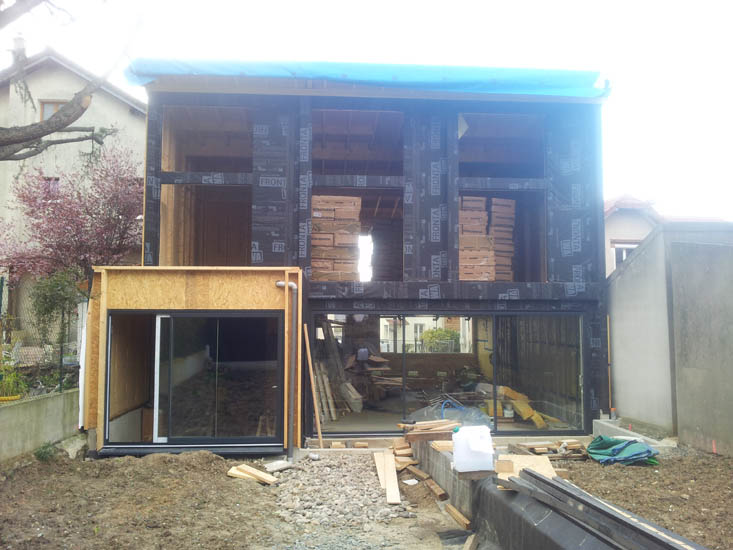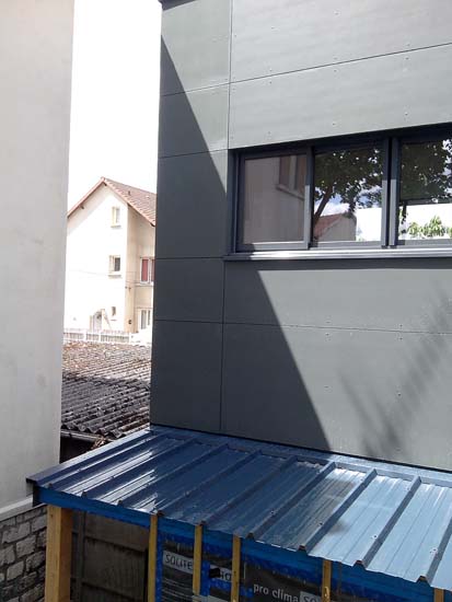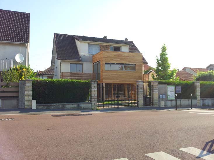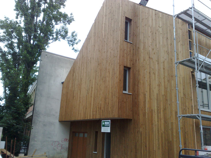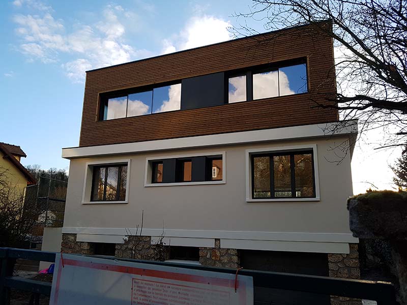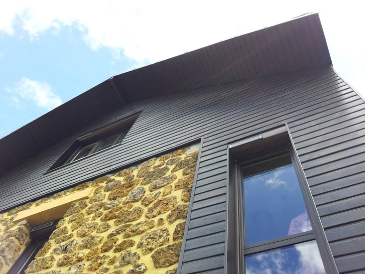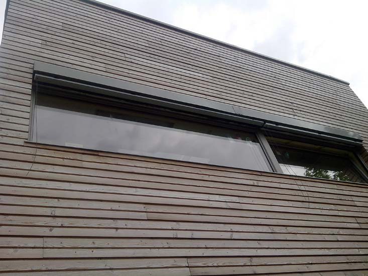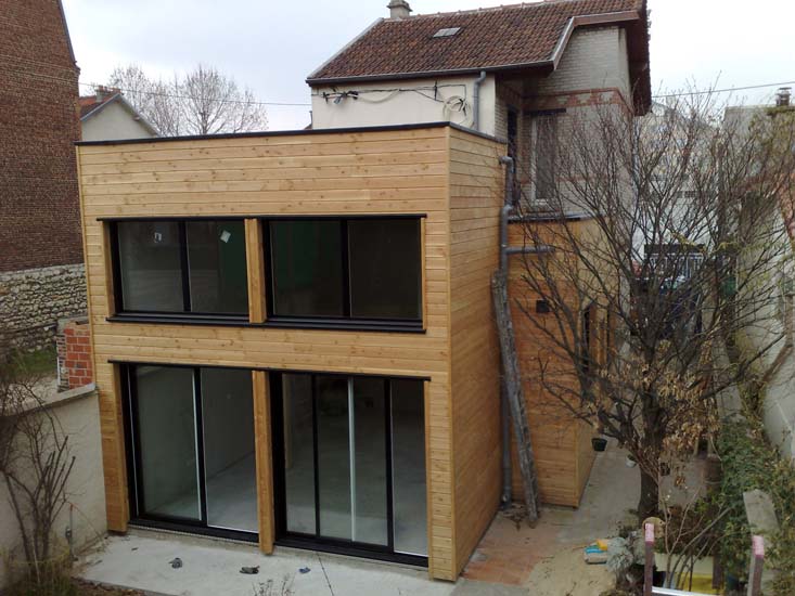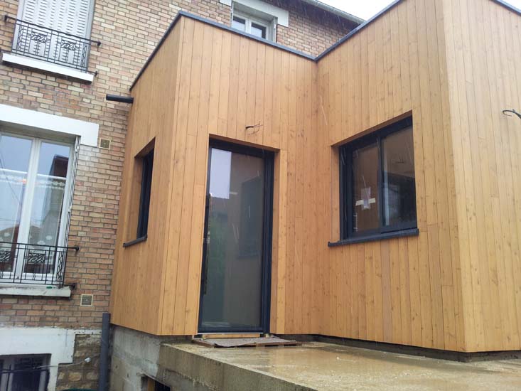 Extension sur deux étages. Toiture avec étanchéité EPDM, skydôme et végétalisation. Isolation extérieure de l'existant et bardage bois en mélèze de l'ensemble.