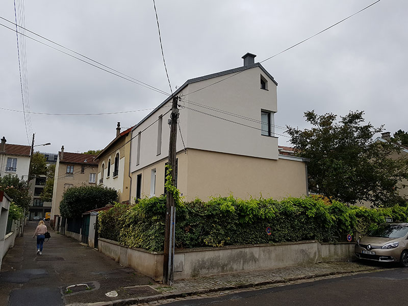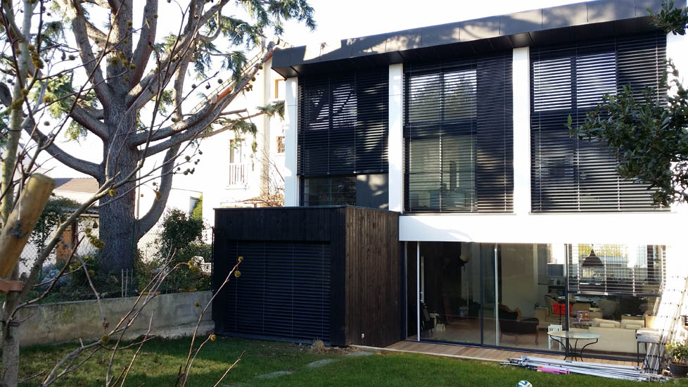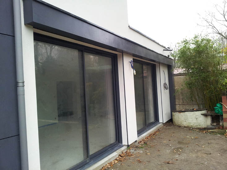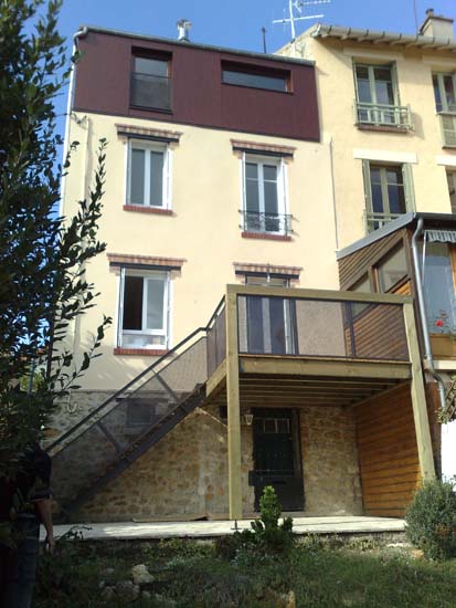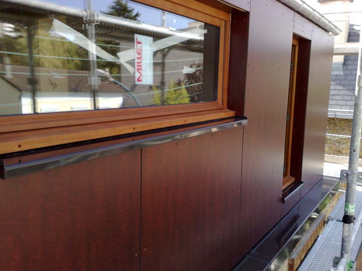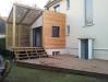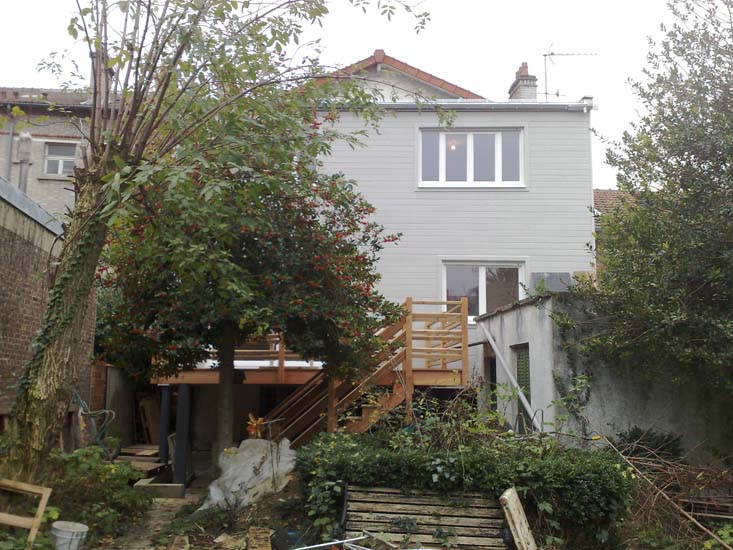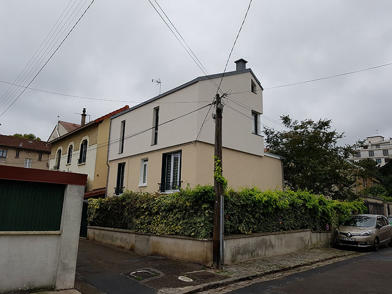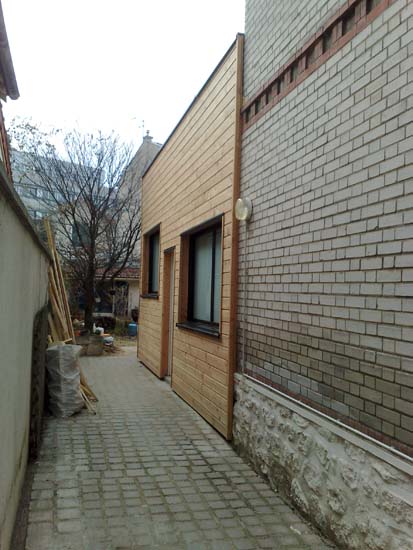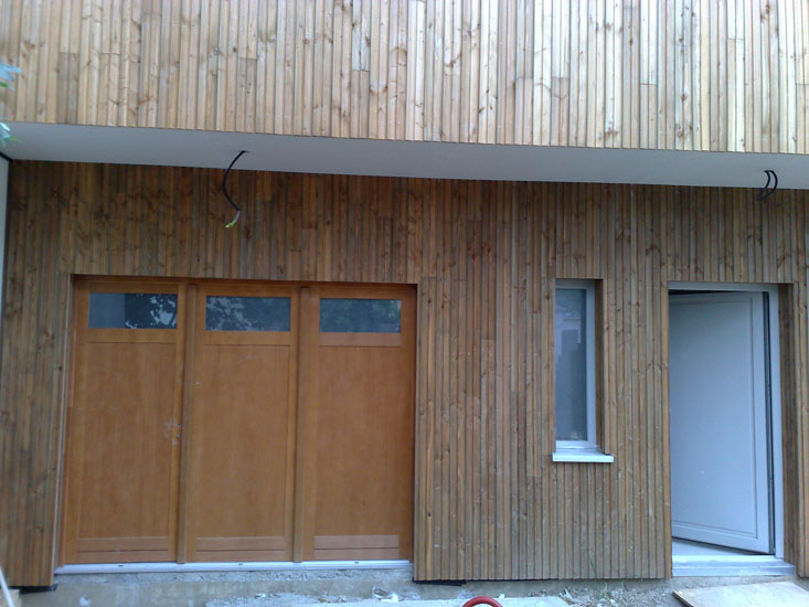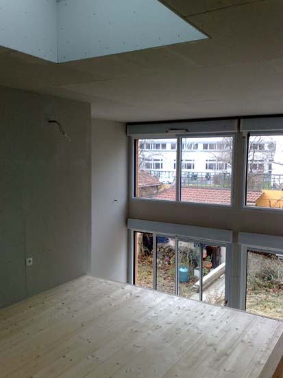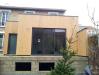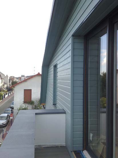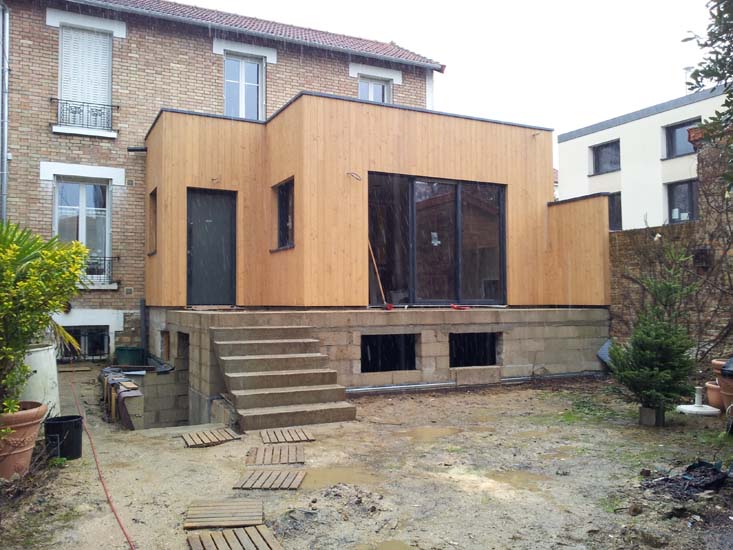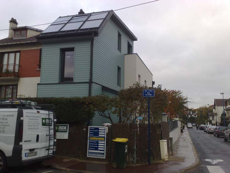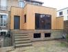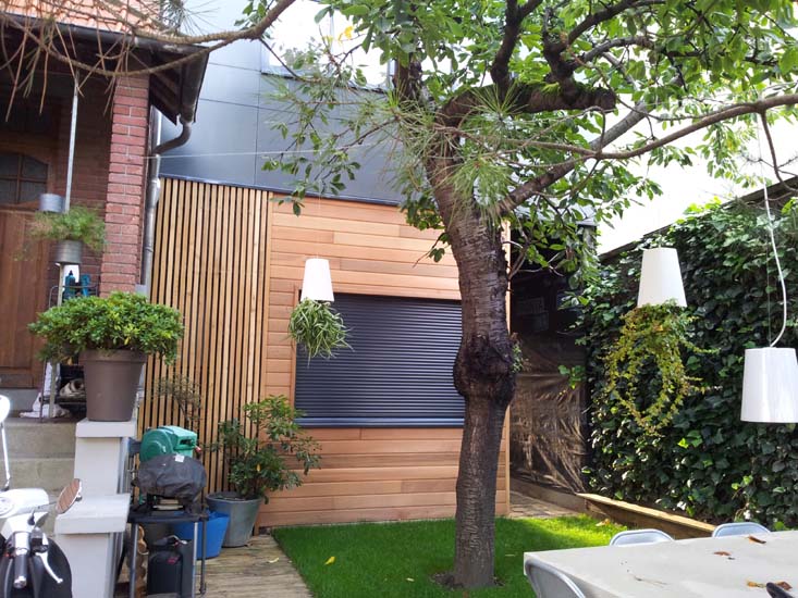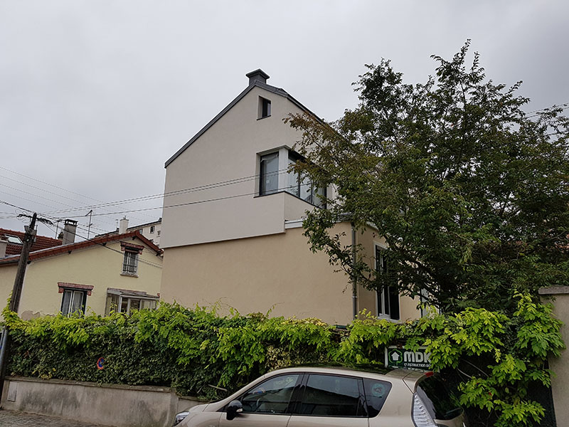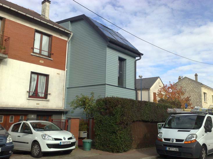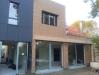 Extension sur deux étages. Toiture avec étanchéité EPDM, skydôme et végétalisation. Isolation extérieure de l'existant et bardage bois en mélèze de l'ensemble.