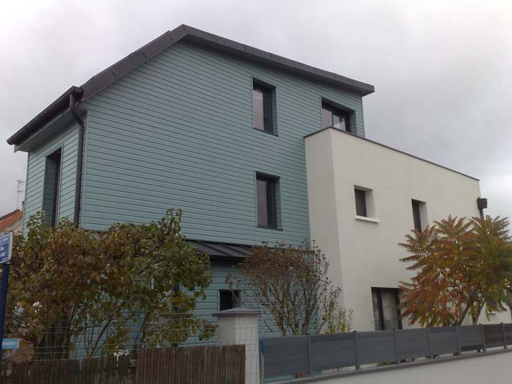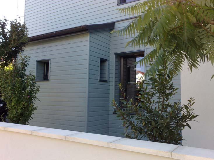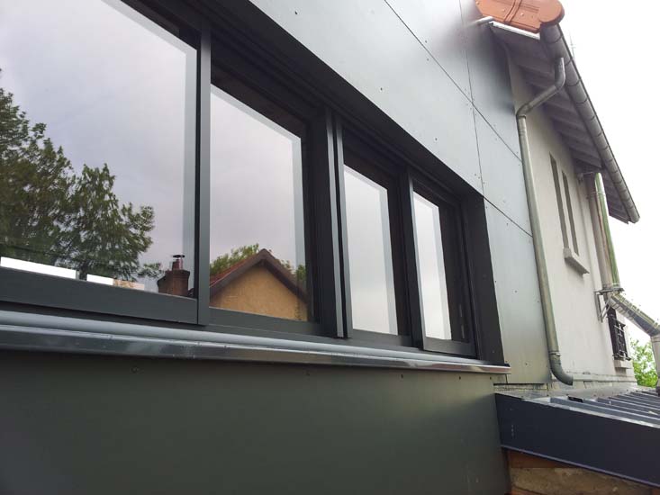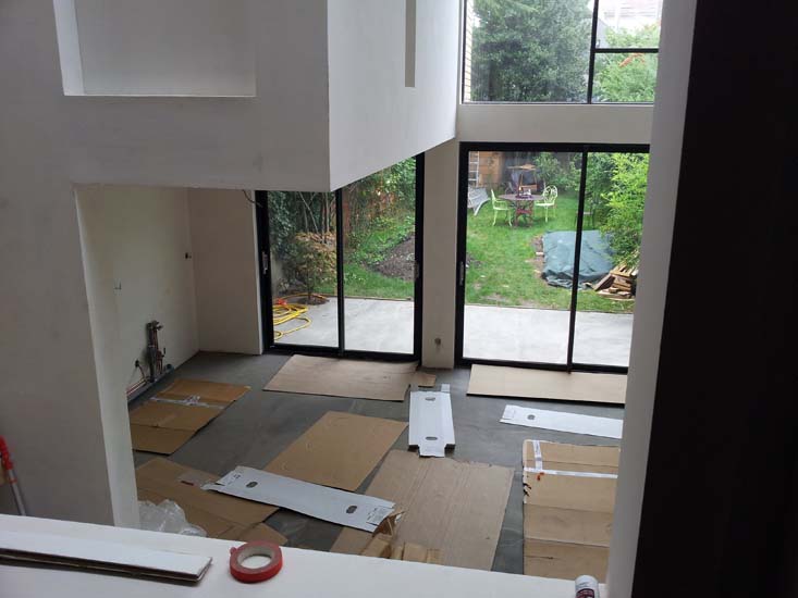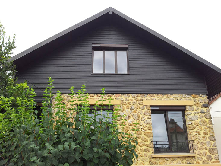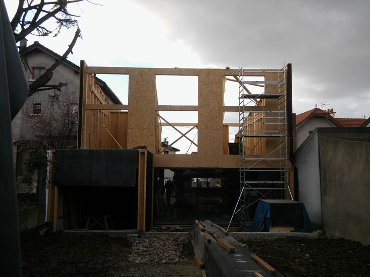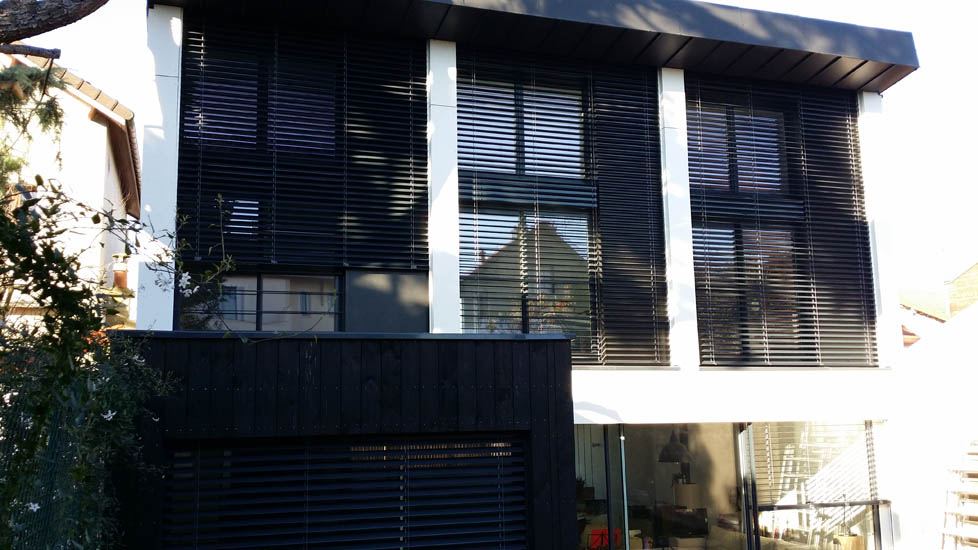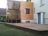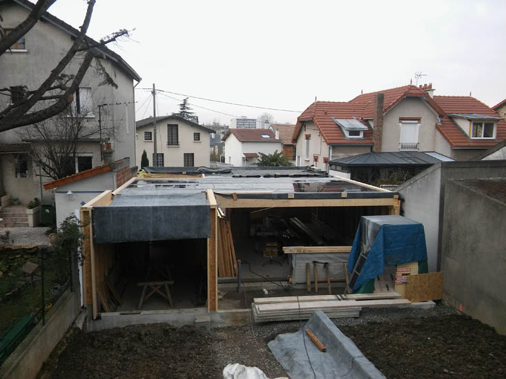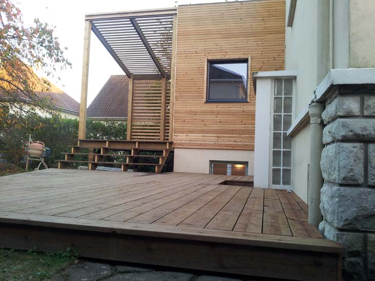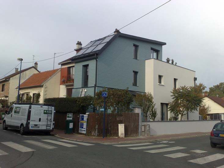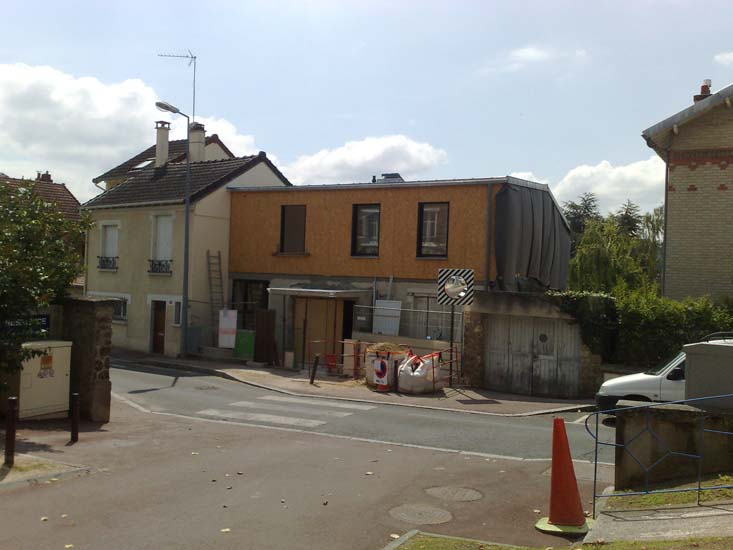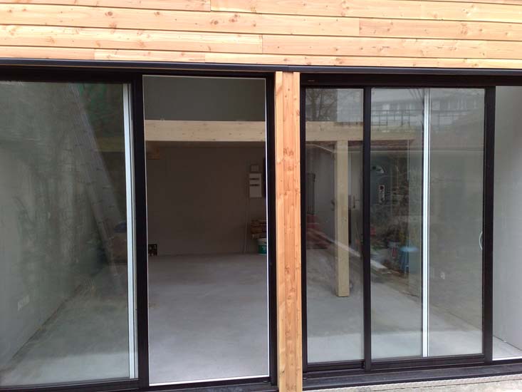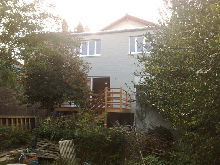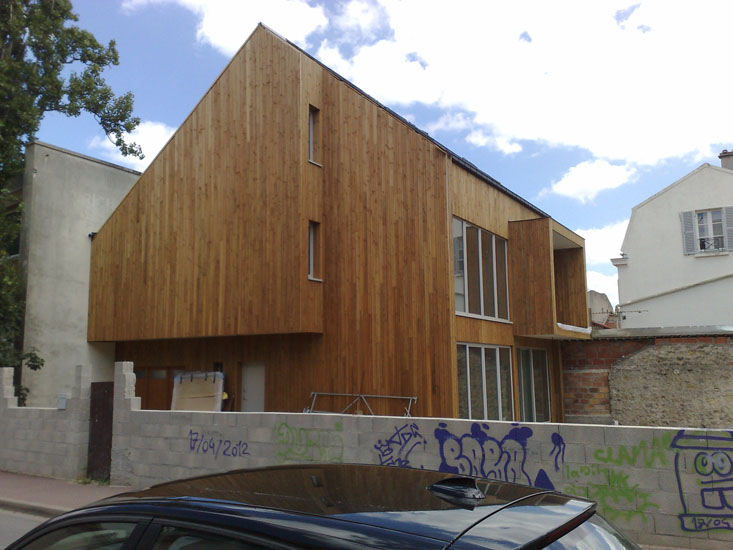 Extension sur deux étages. Toiture avec étanchéité EPDM, skydôme et végétalisation. Isolation extérieure de l'existant et bardage bois en mélèze de l'ensemble.