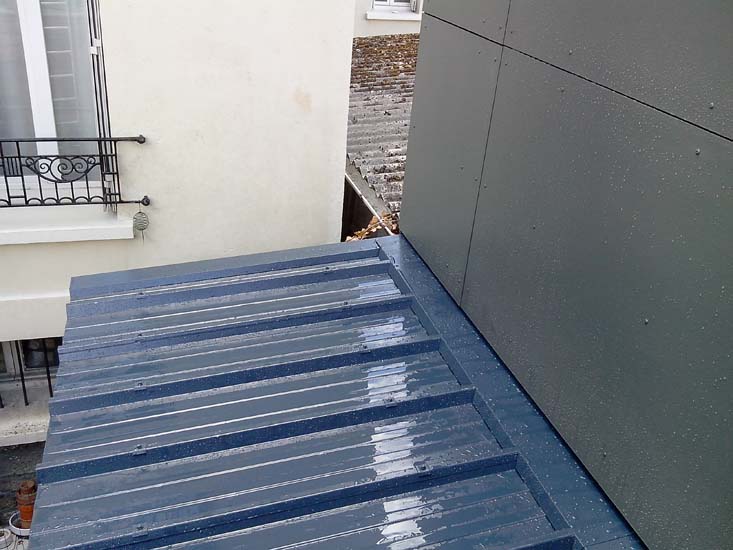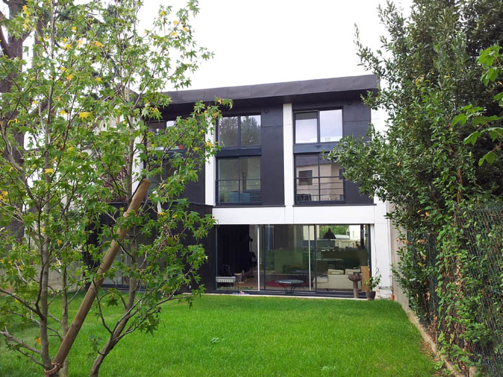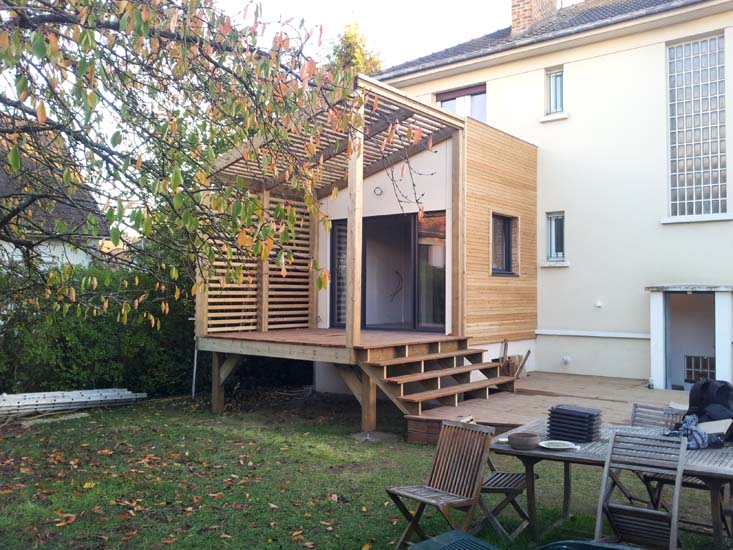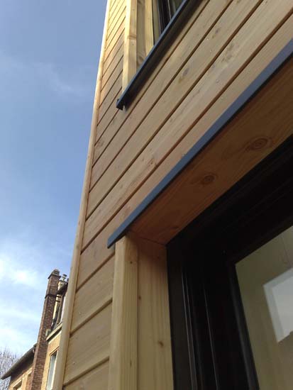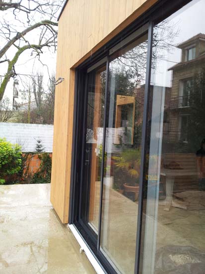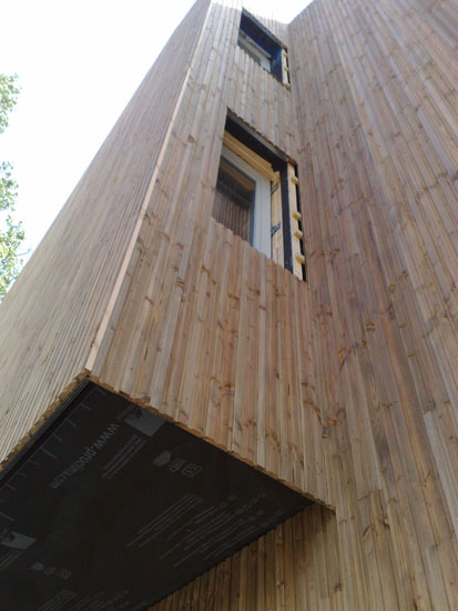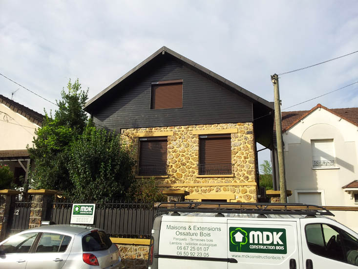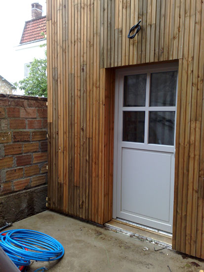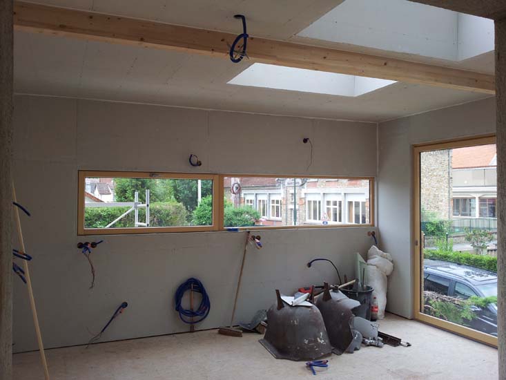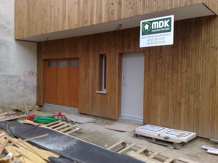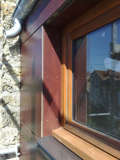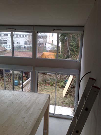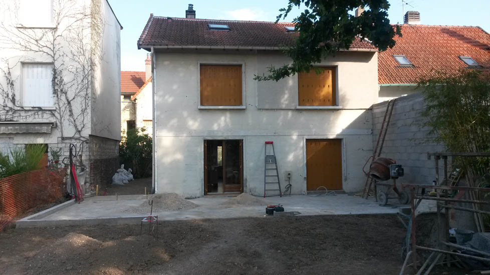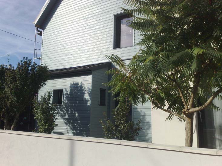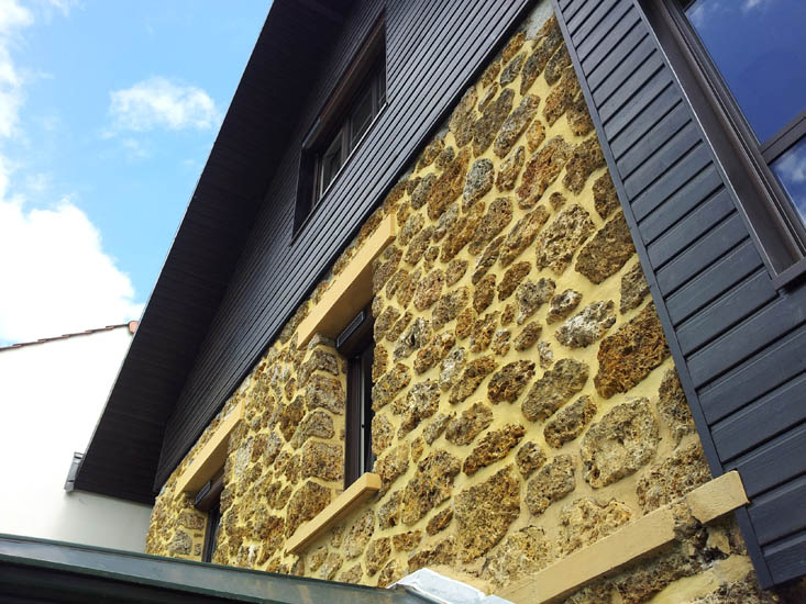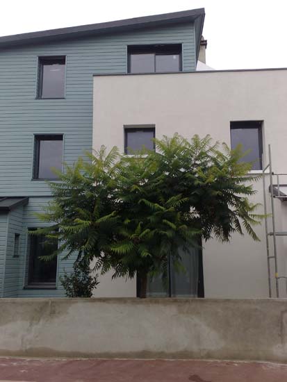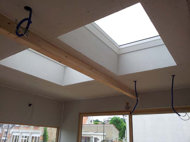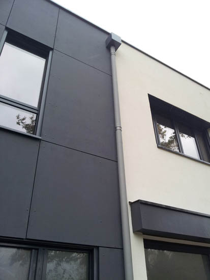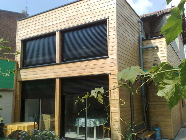 Extension sur deux étages. Toiture avec étanchéité EPDM, skydôme et végétalisation. Isolation extérieure de l'existant et bardage bois en mélèze de l'ensemble.