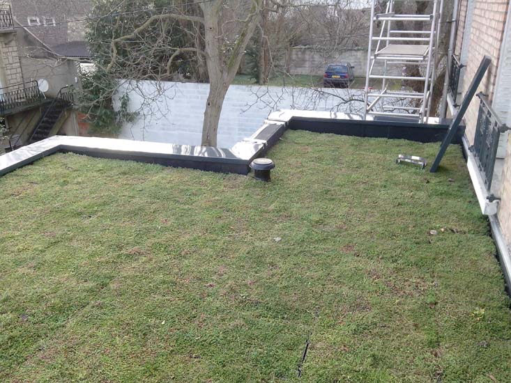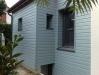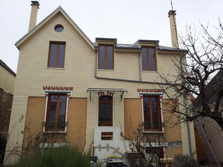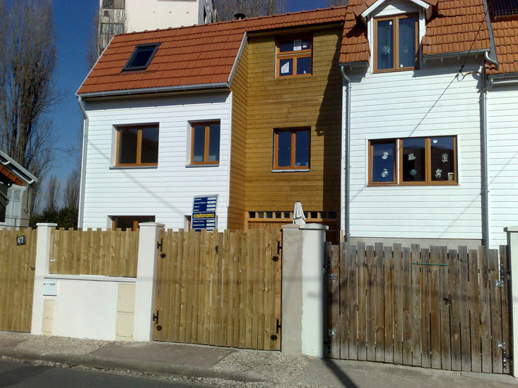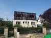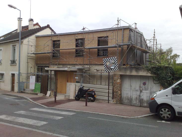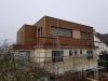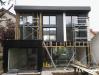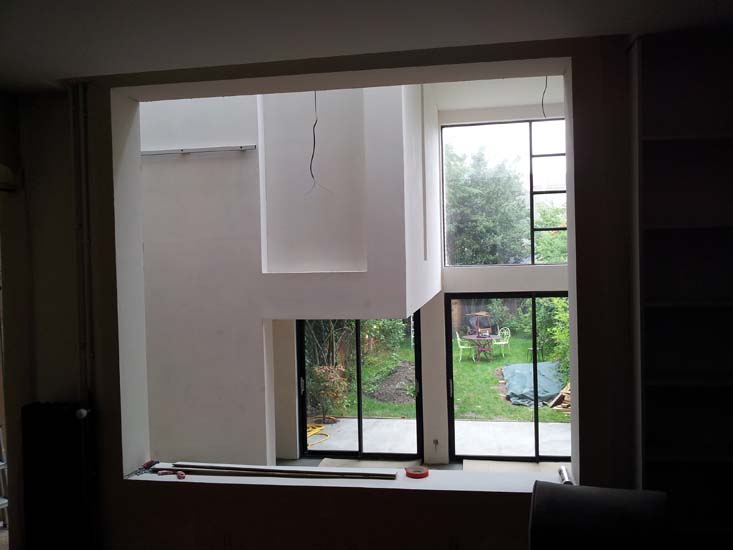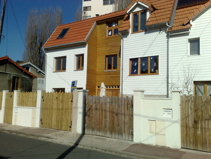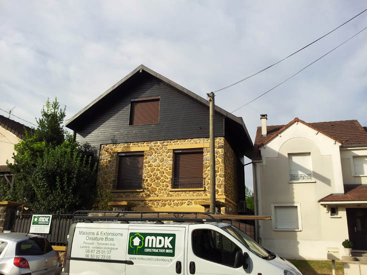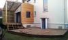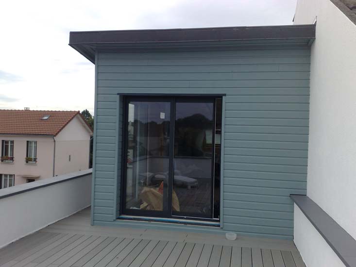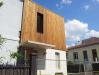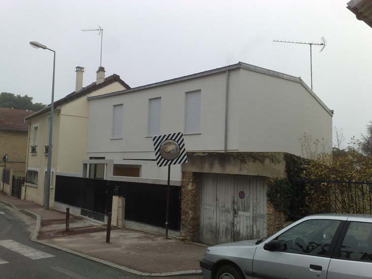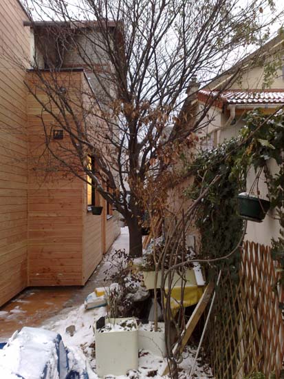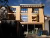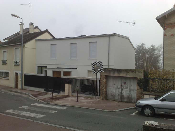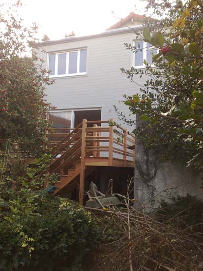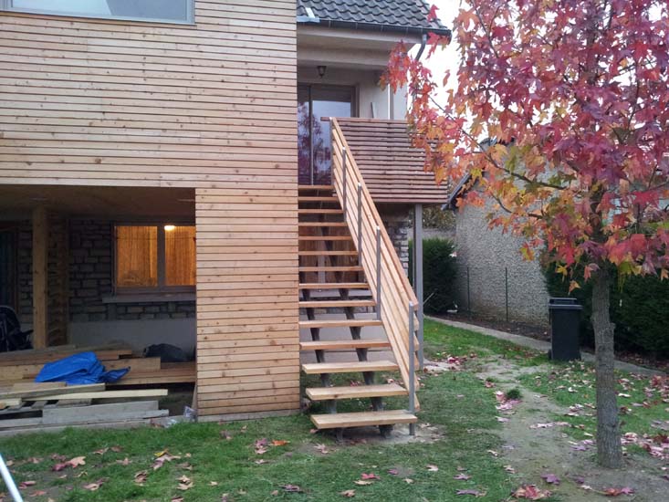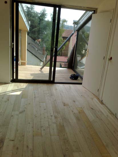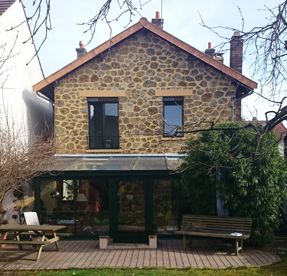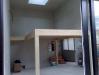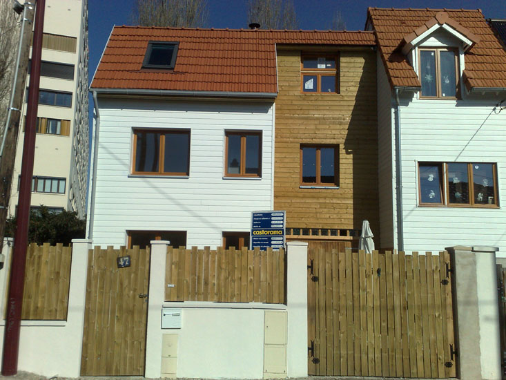 Extension sur deux étages. Toiture avec étanchéité EPDM, skydôme et végétalisation. Isolation extérieure de l'existant et bardage bois en mélèze de l'ensemble.