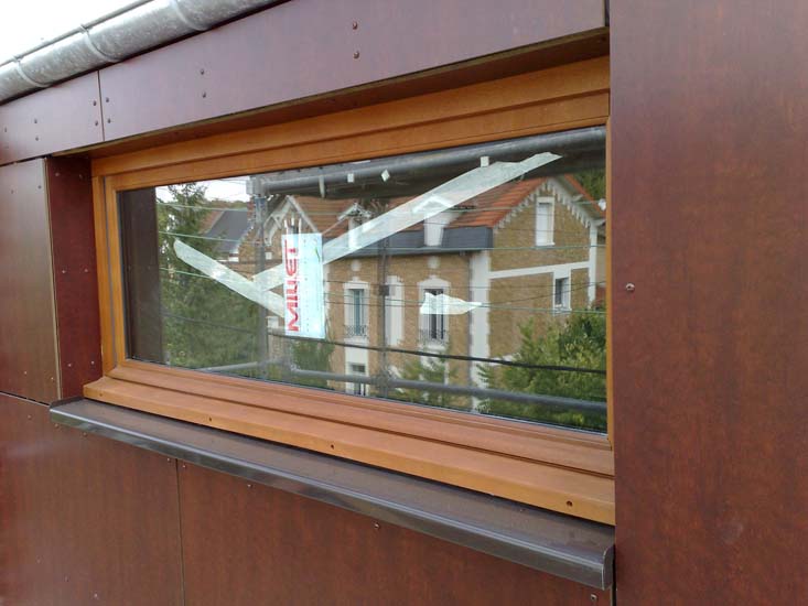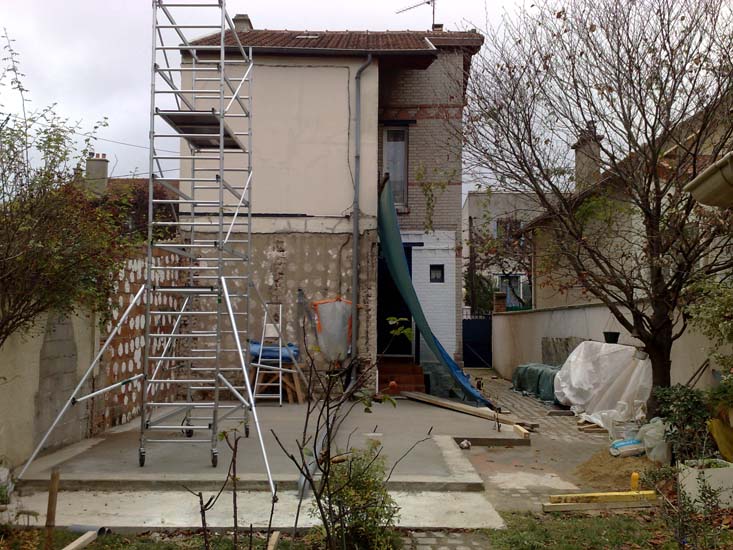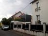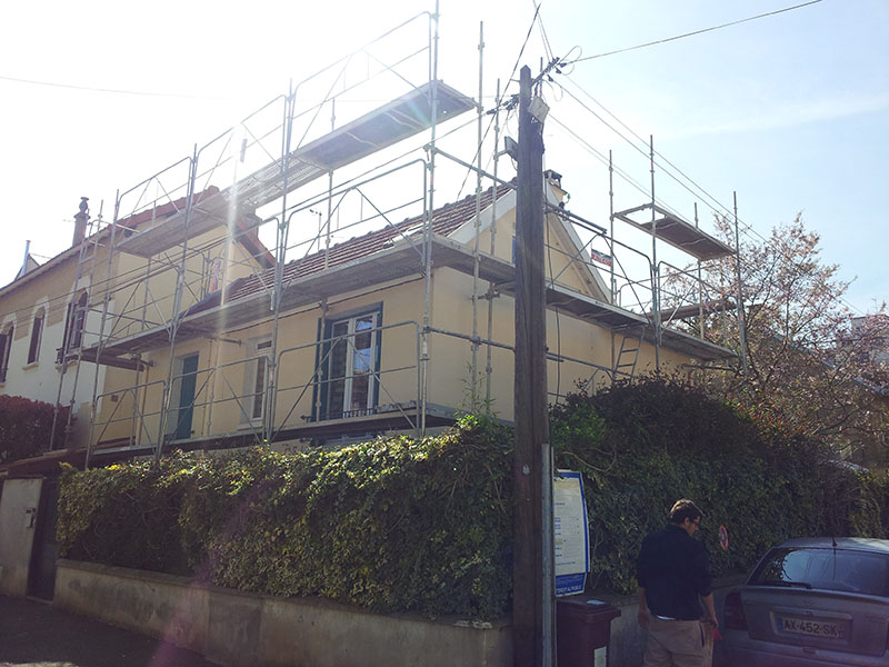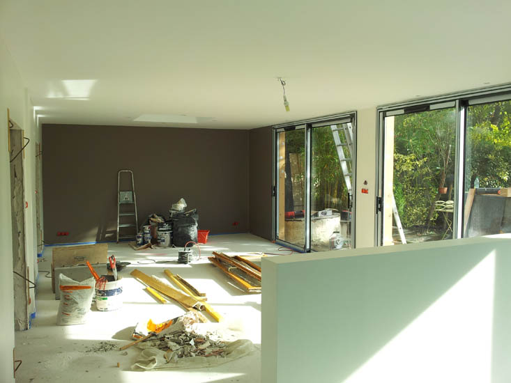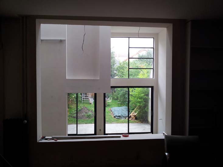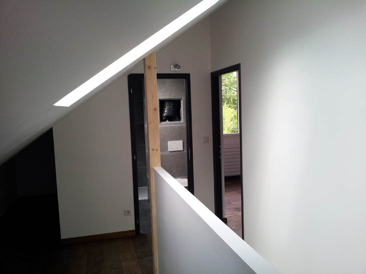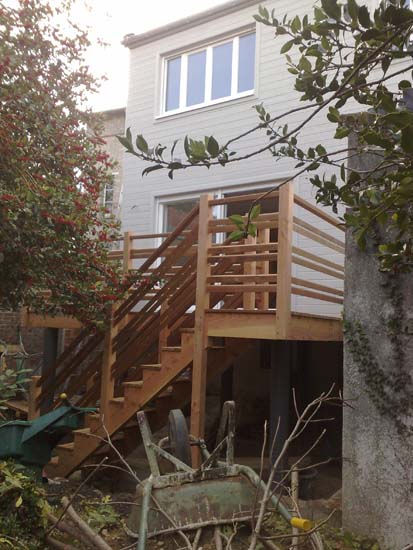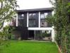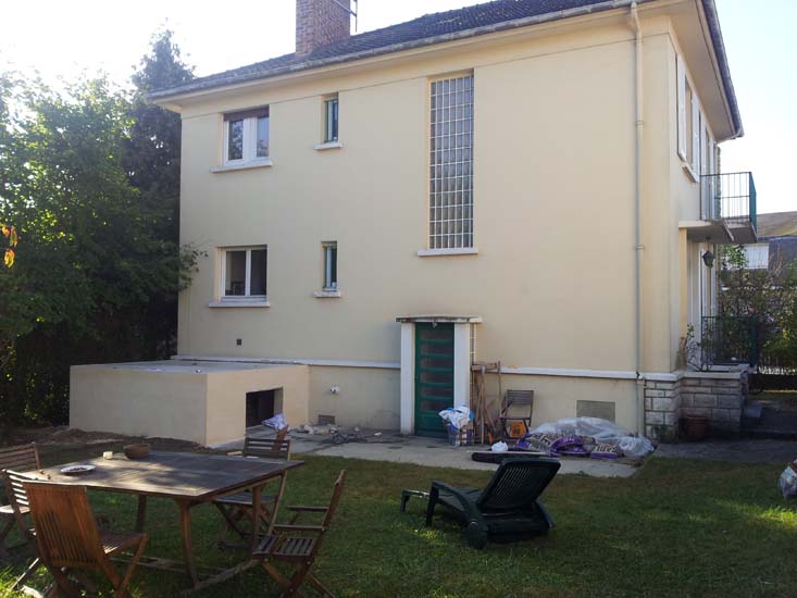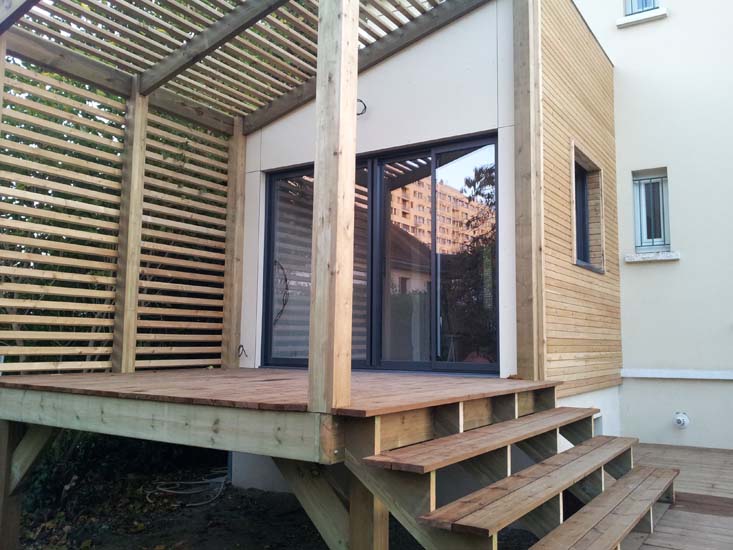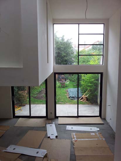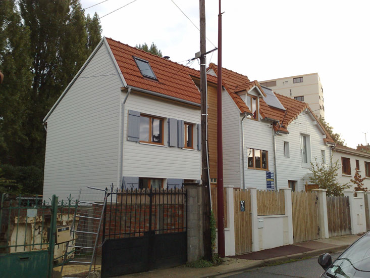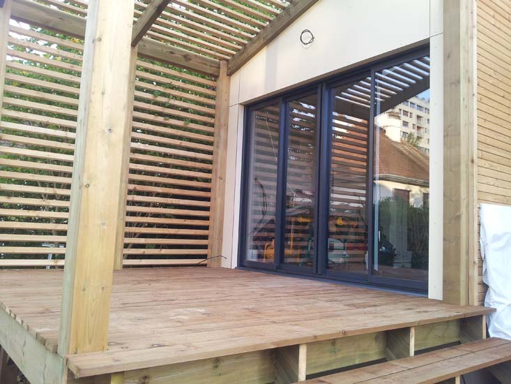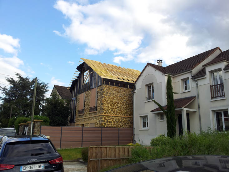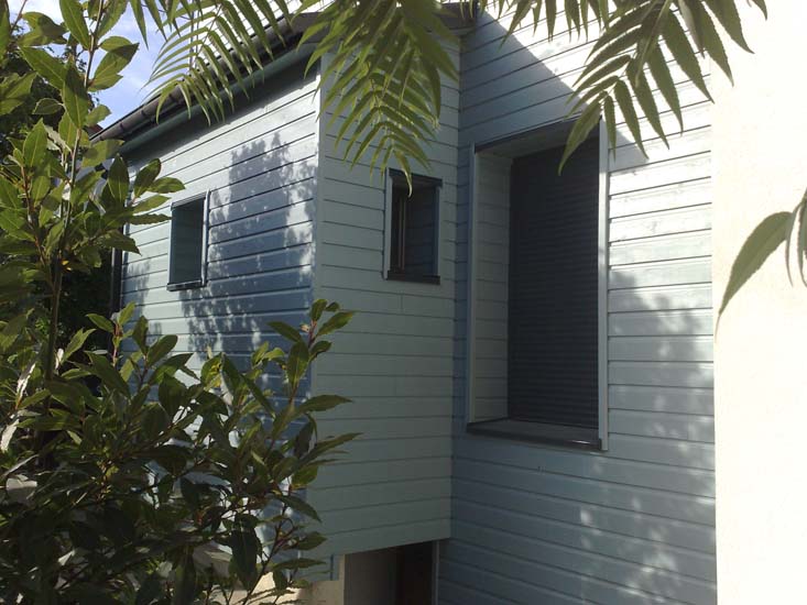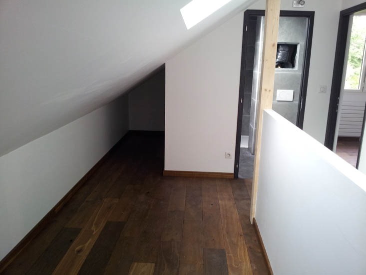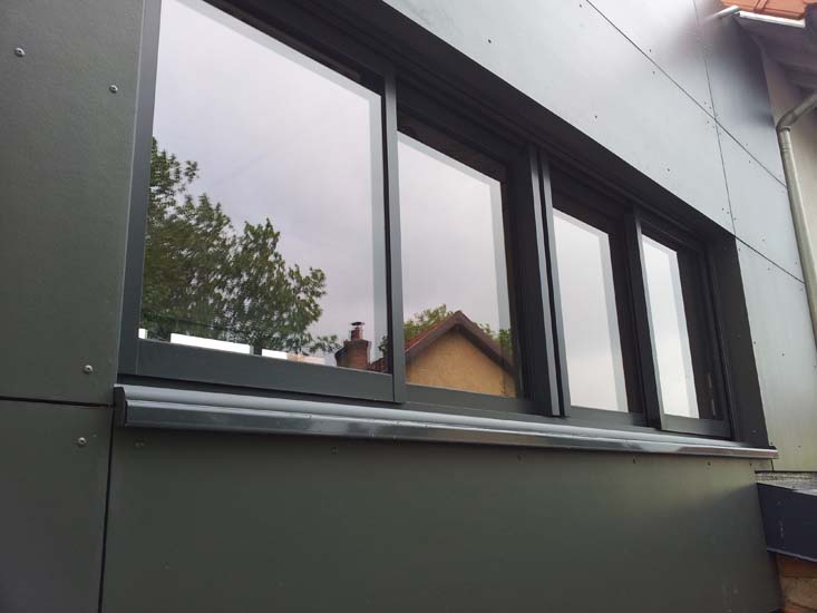 Extension sur deux étages. Toiture avec étanchéité EPDM, skydôme et végétalisation. Isolation extérieure de l'existant et bardage bois en mélèze de l'ensemble.