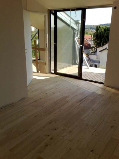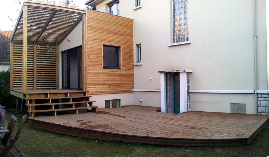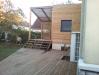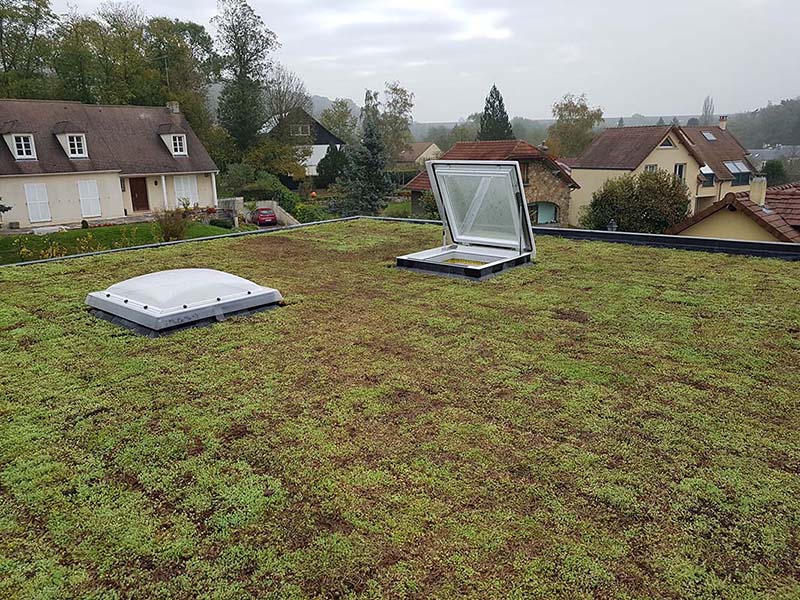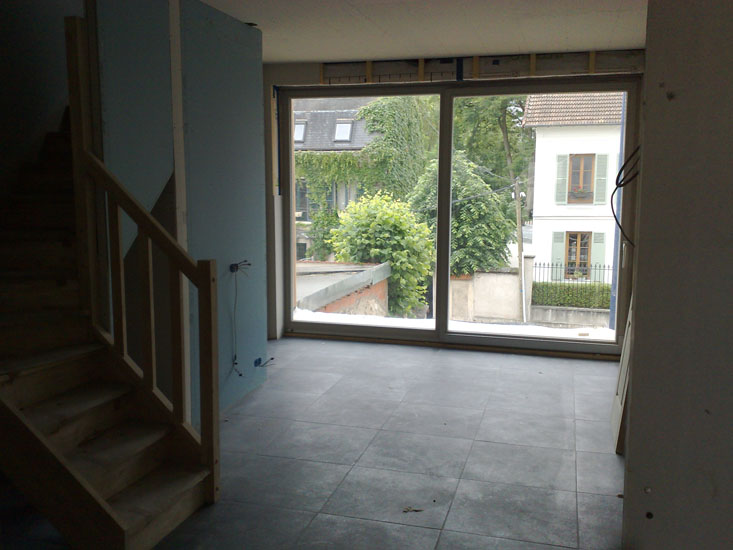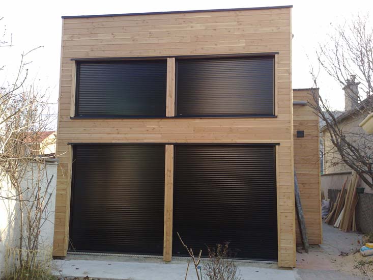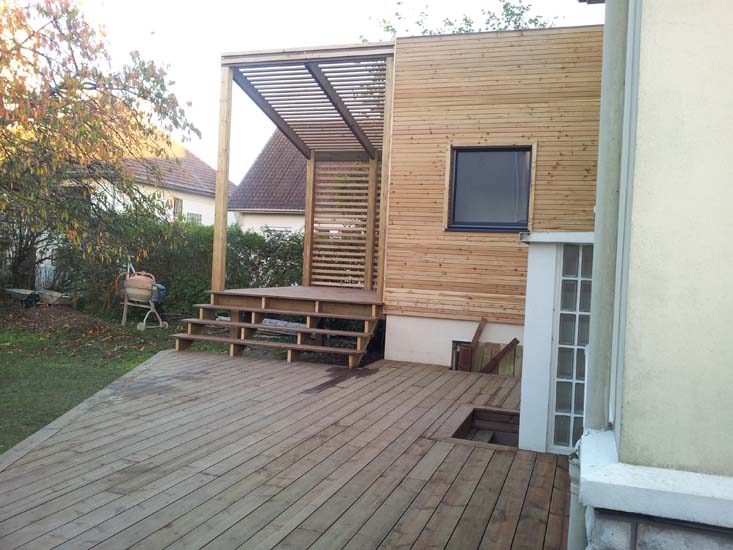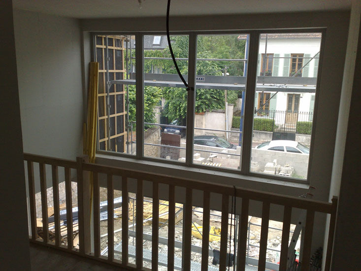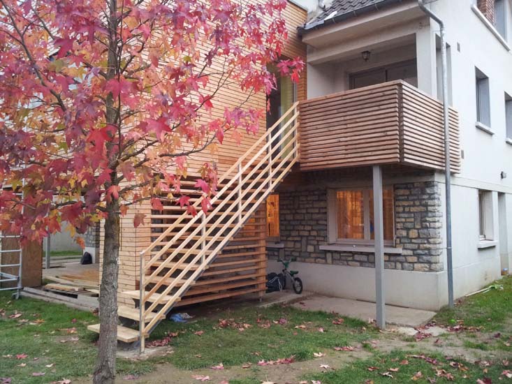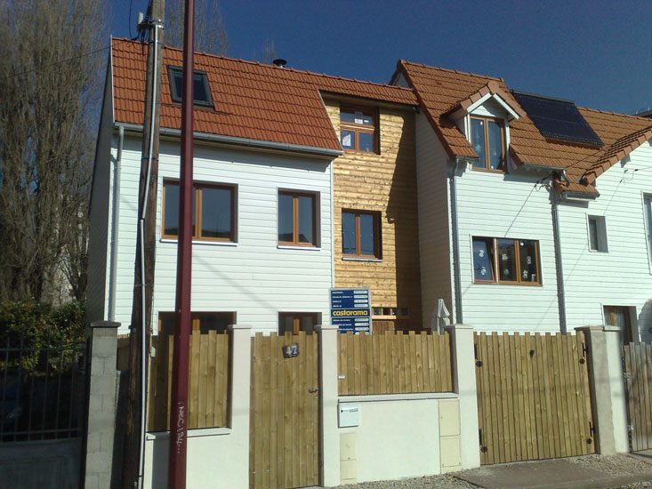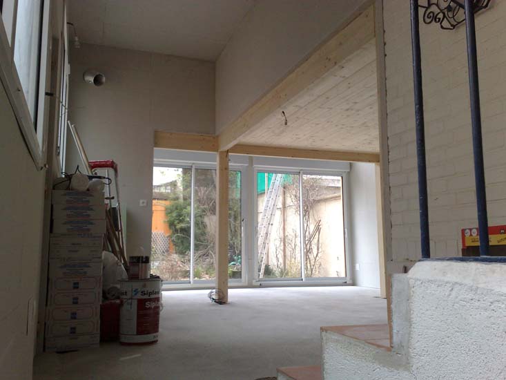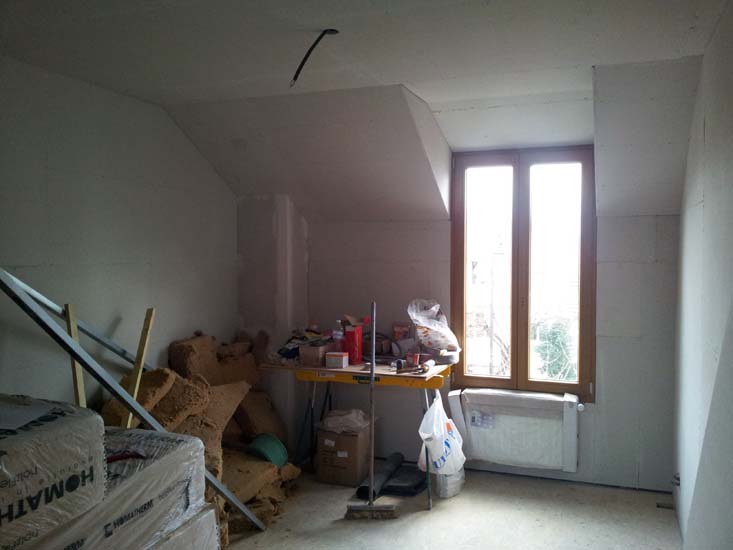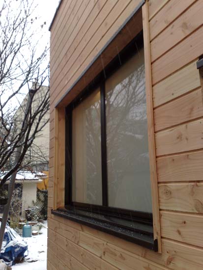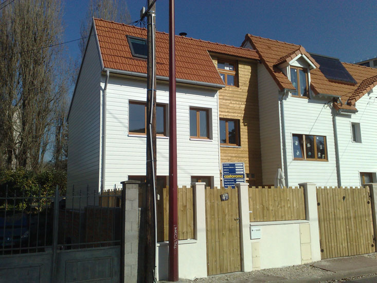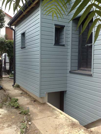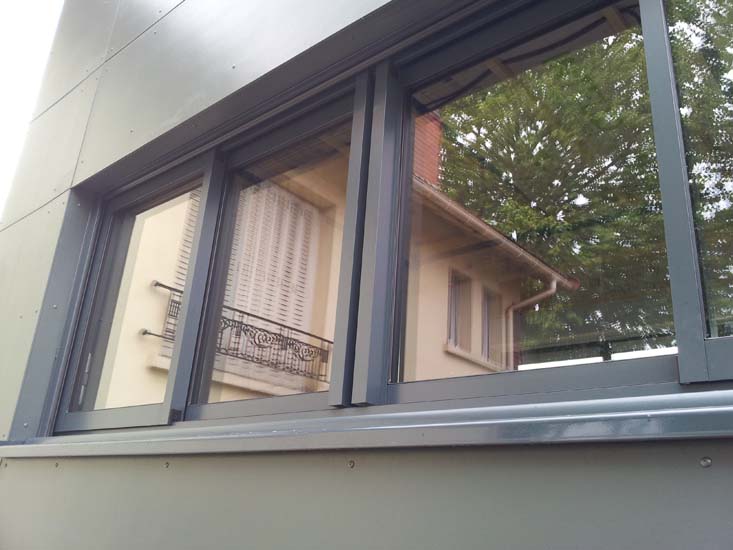 Extension sur deux étages. Toiture avec étanchéité EPDM, skydôme et végétalisation. Isolation extérieure de l'existant et bardage bois en mélèze de l'ensemble.