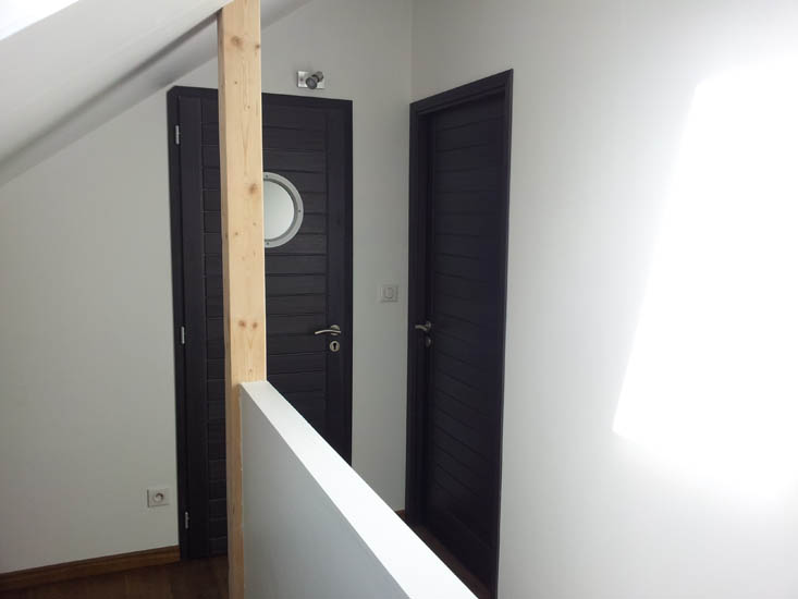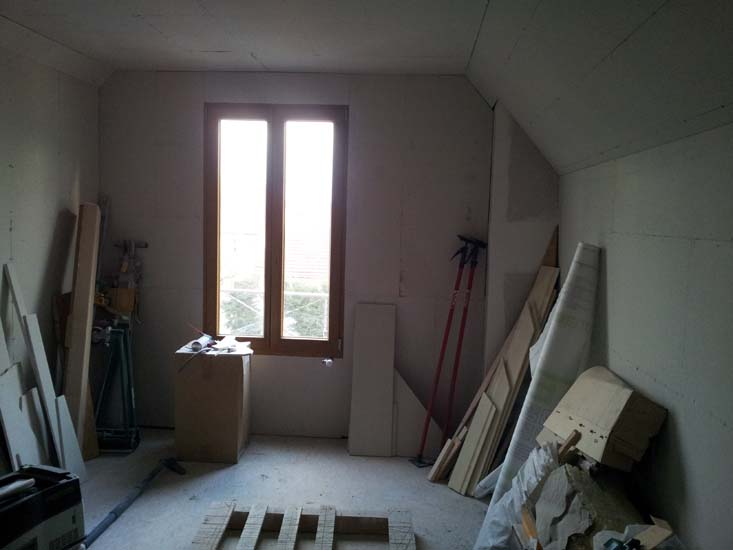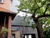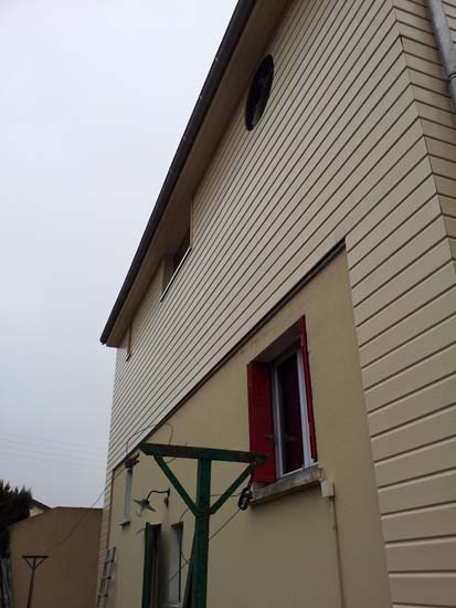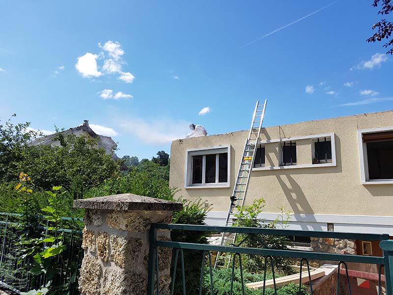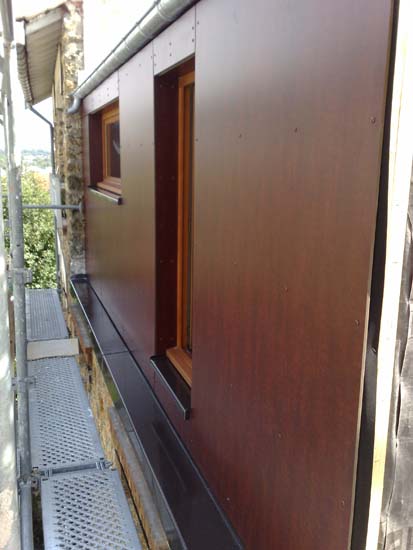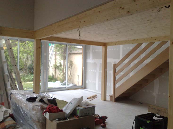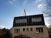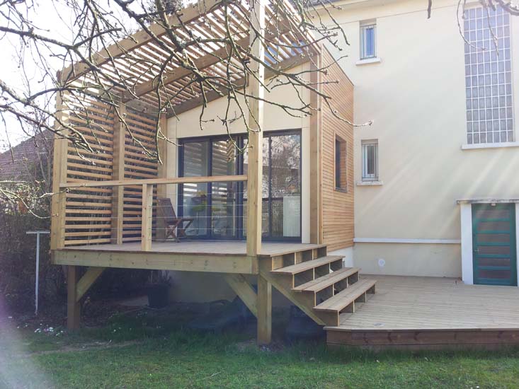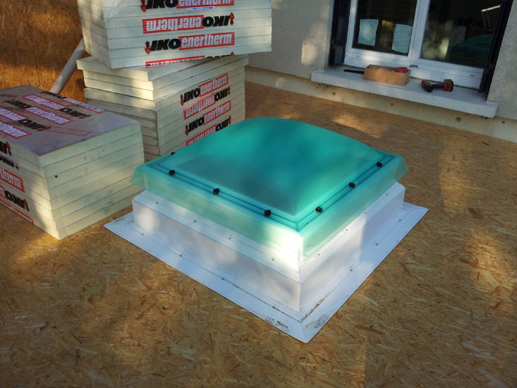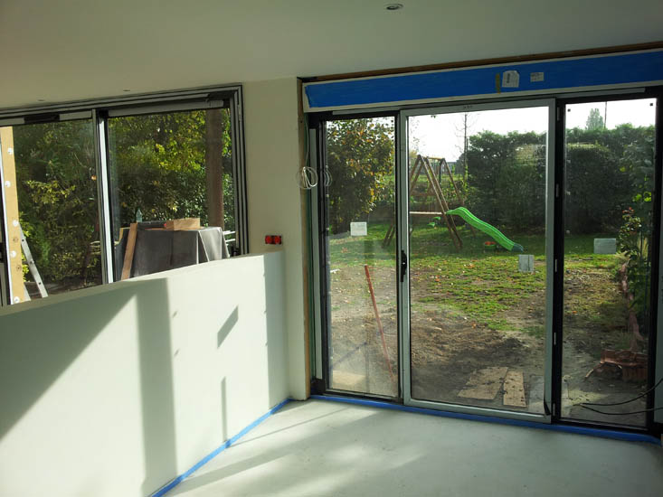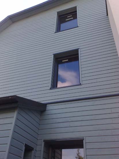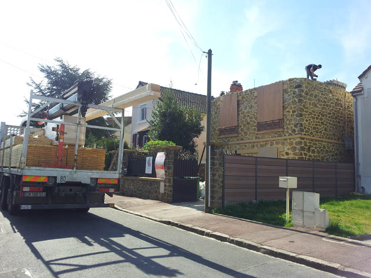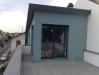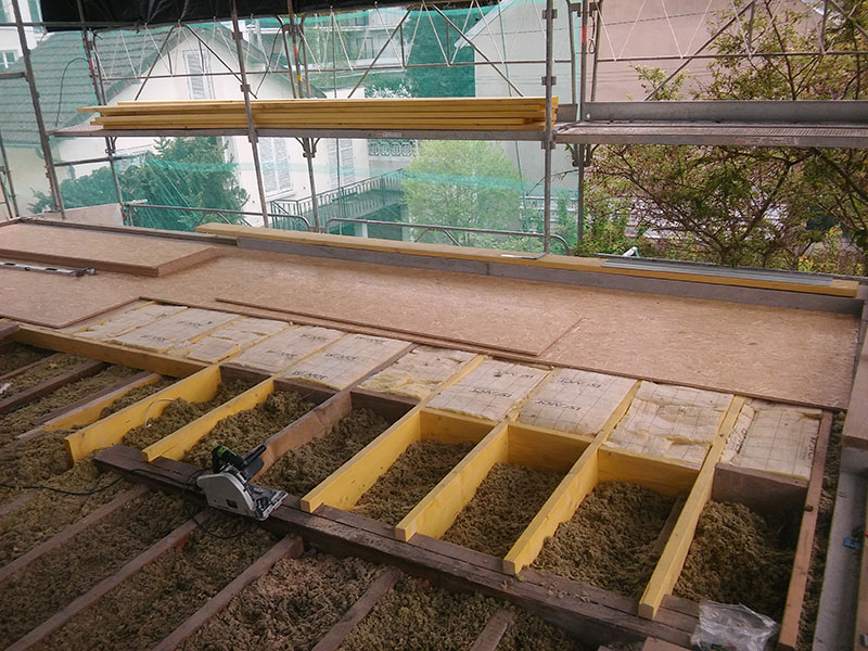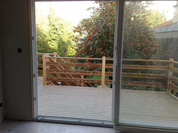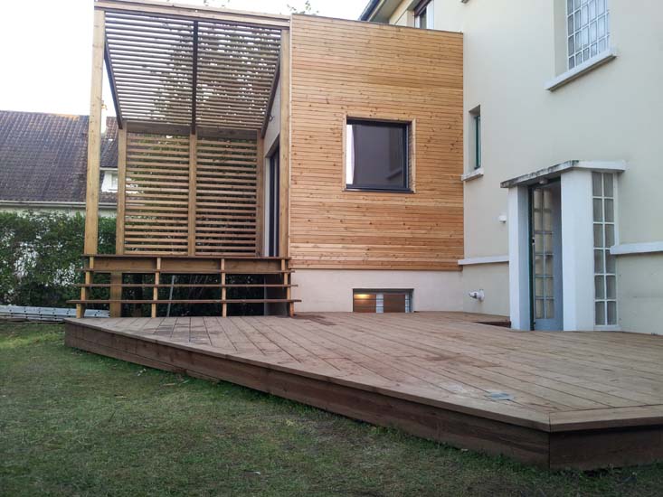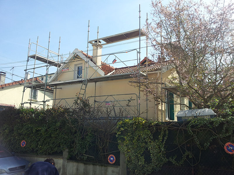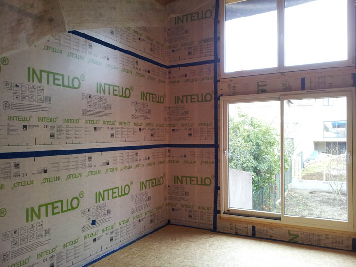 Extension sur deux étages. Toiture avec étanchéité EPDM, skydôme et végétalisation. Isolation extérieure de l'existant et bardage bois en mélèze de l'ensemble.