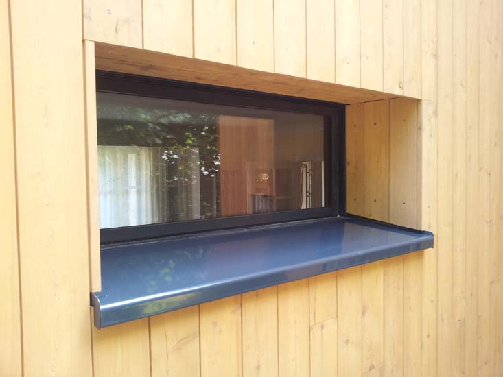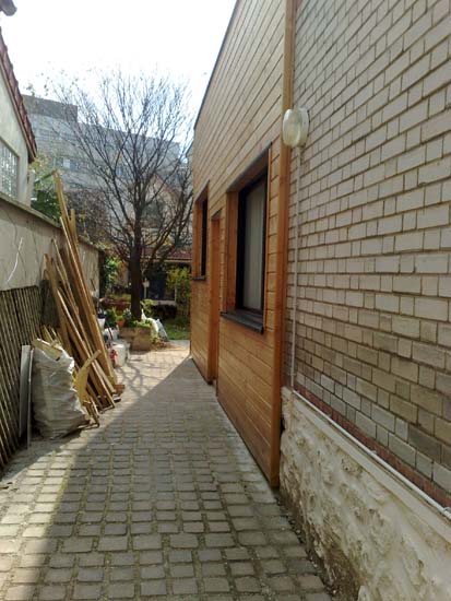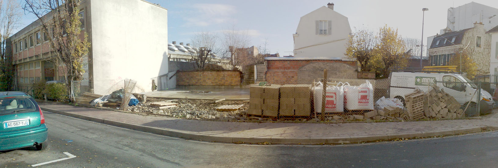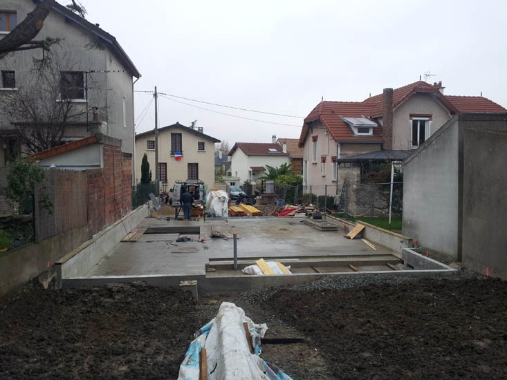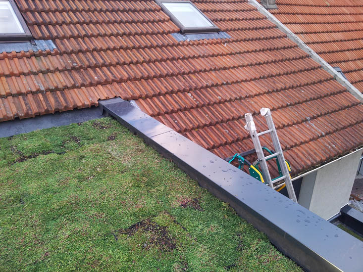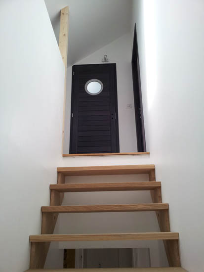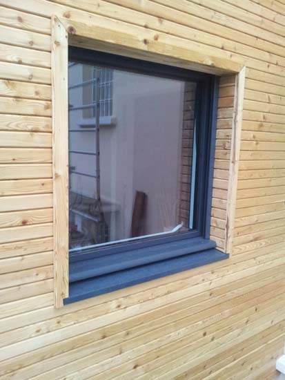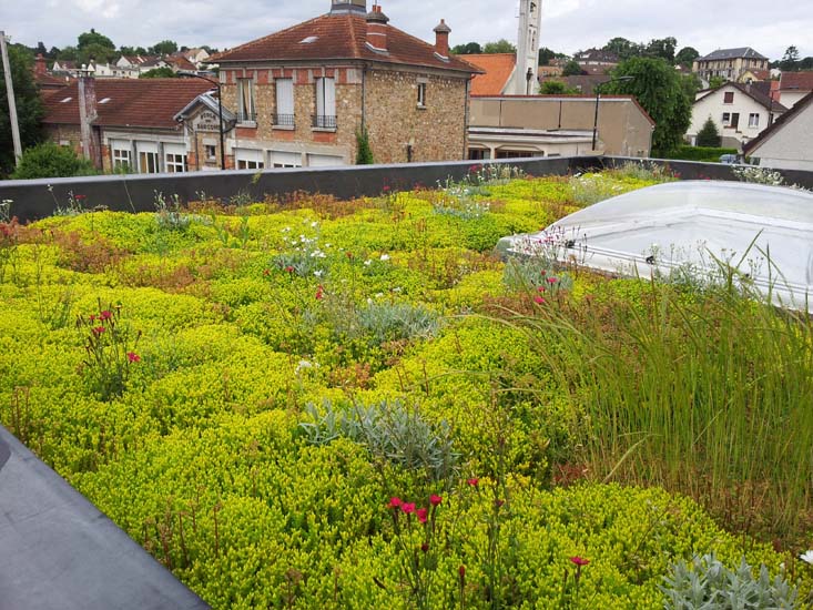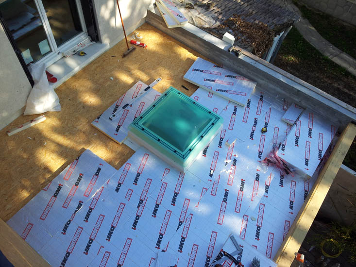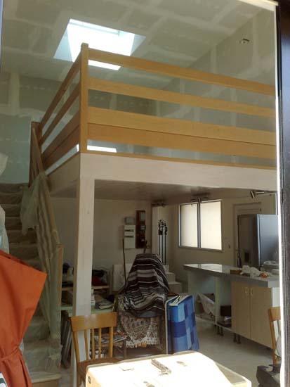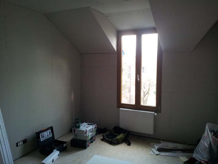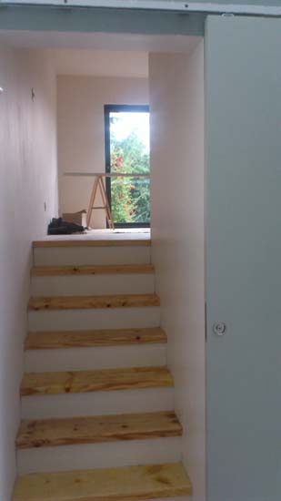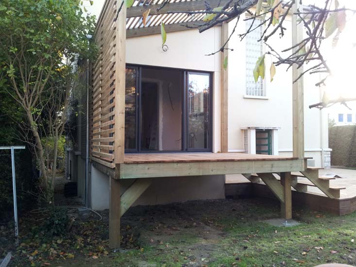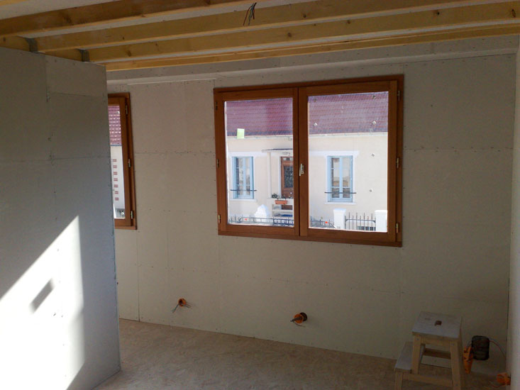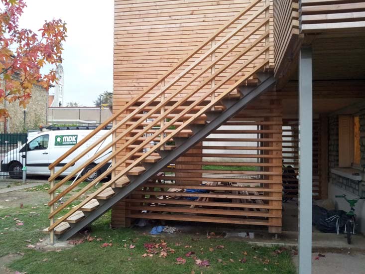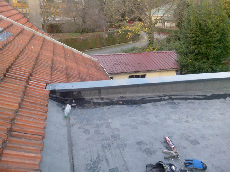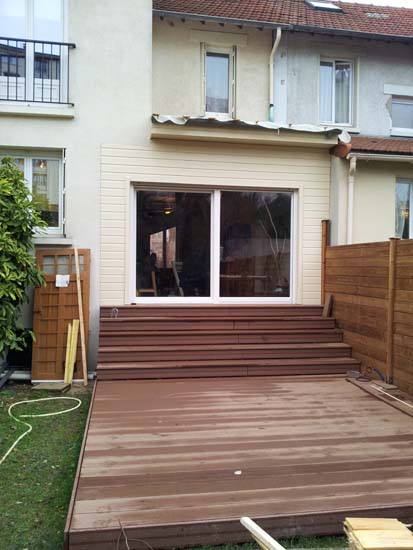 Extension sur deux étages. Toiture avec étanchéité EPDM, skydôme et végétalisation. Isolation extérieure de l'existant et bardage bois en mélèze de l'ensemble.