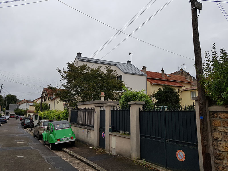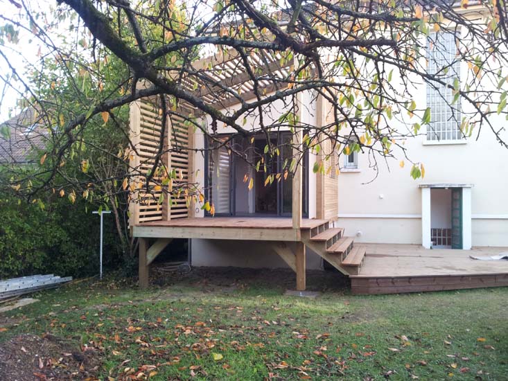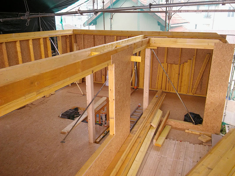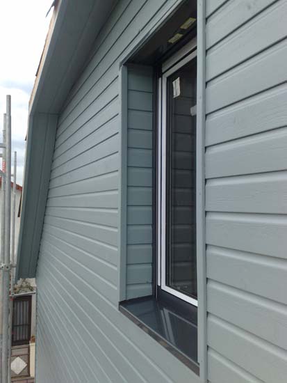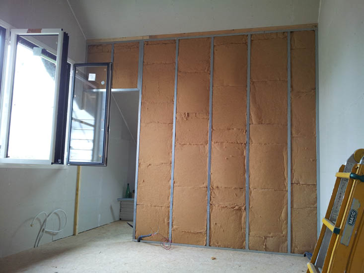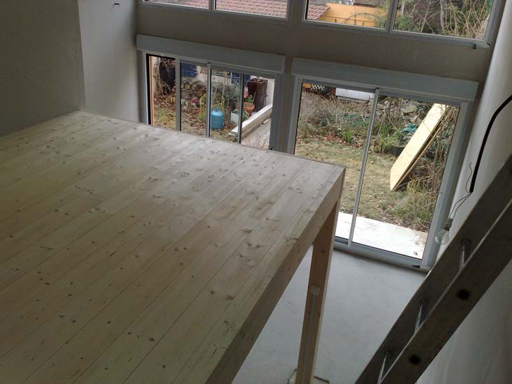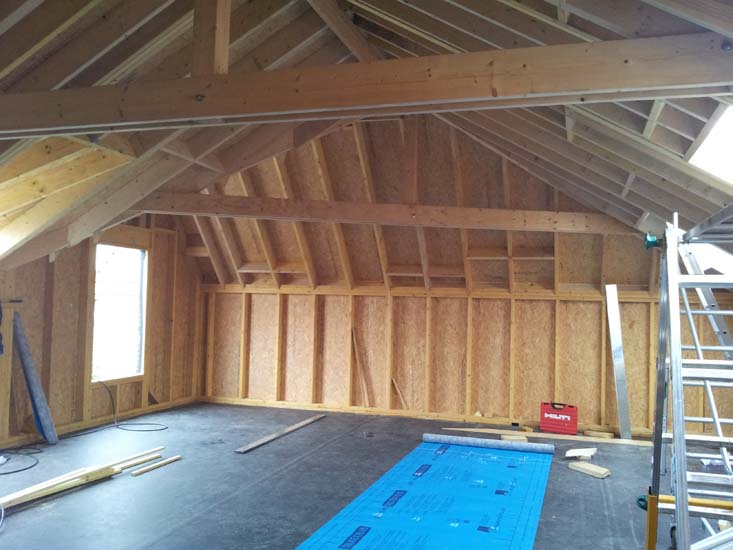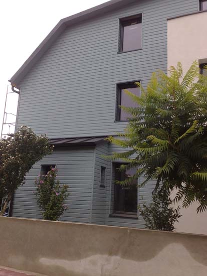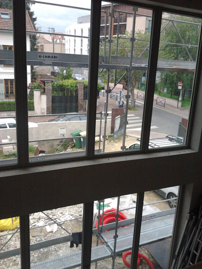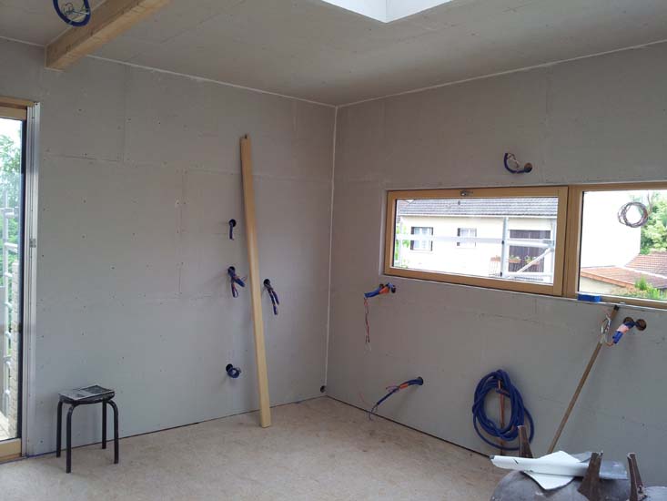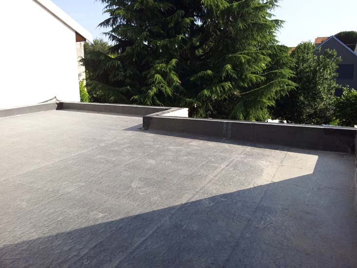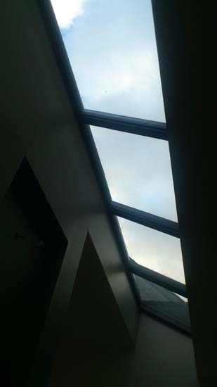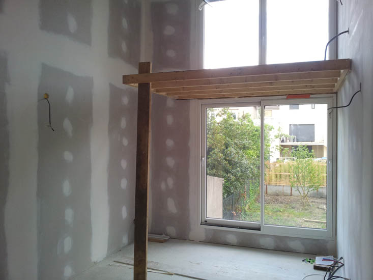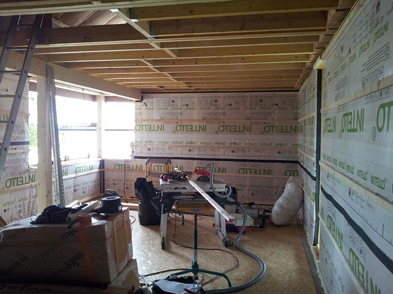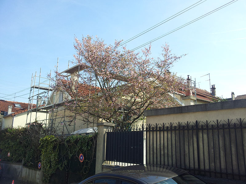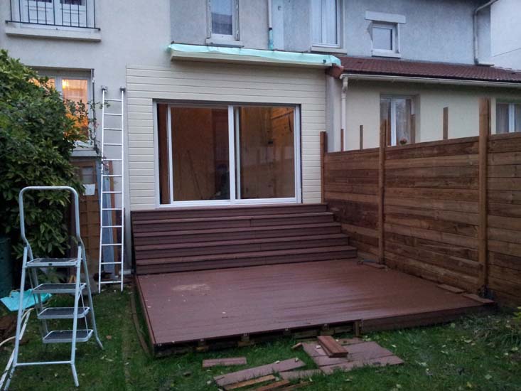 Extension sur deux étages. Toiture avec étanchéité EPDM, skydôme et végétalisation. Isolation extérieure de l'existant et bardage bois en mélèze de l'ensemble.